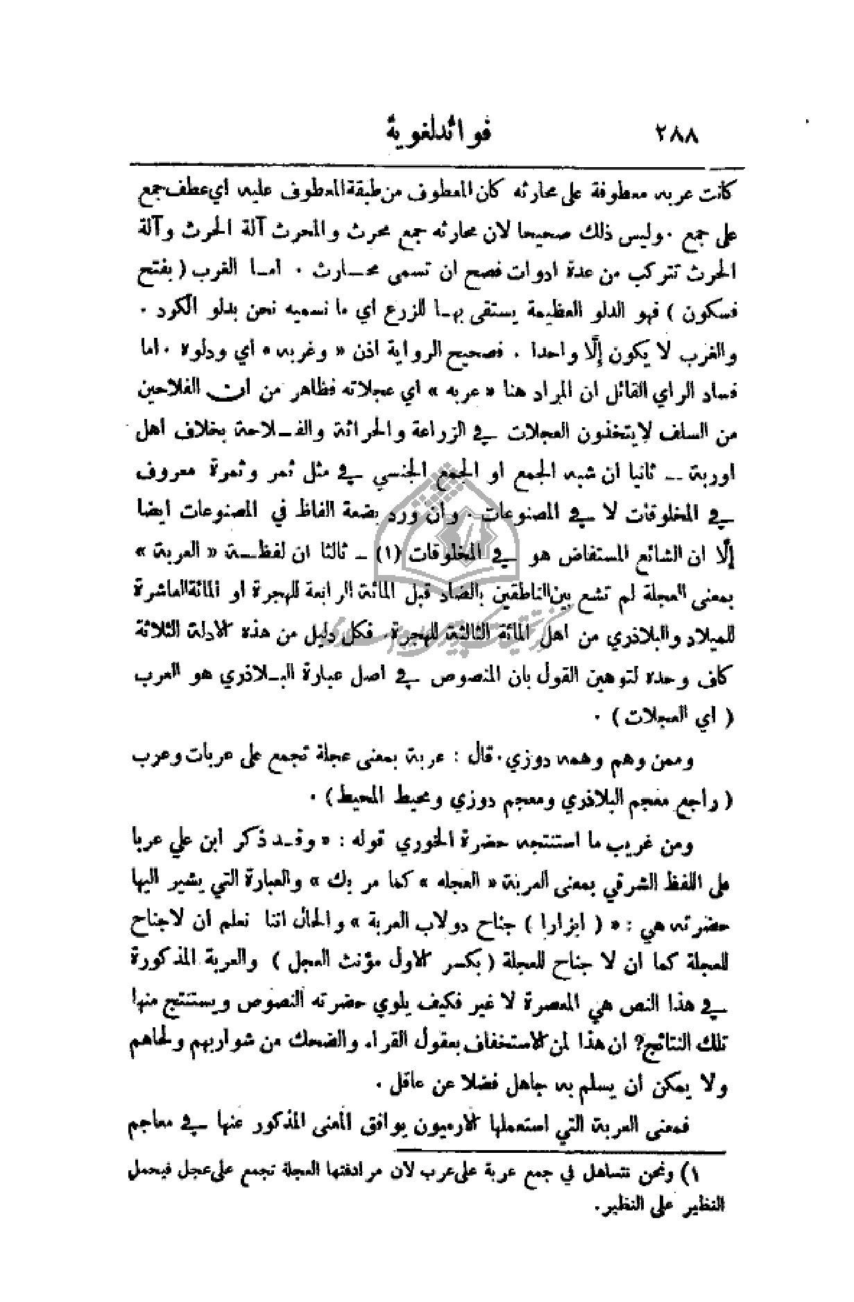 كانت عربه معطوفة على محارثه كان المعطوف من طبقة المعطوف عليه أي عطف جمع على جمع. وليس ذلك صحيحاً لأن محارثه ليس جمع محرث والمحرث آلة الحرث وآلة الحرث تتركب من عدة أدوات فصح أن تسمى محارث. أما الغرب (بفتح فسكون) فهو الدلو العظيمة يستقى بها للزرع أي ما نسميه نحن بدلو الكرد. والغرب لا يكون إلا واحداً. فصحيح الرواية إذن (وغربه) أي ودلوه. أما فساد الرأي المراد هنا (عربه) أي عجلاته فظاهر من أن الفلاحين من السلف لا يتخذون العجلات في الزراعة والحراثة والفلاحة بخلاف أهل أوربة - ثانياً أن شبه الجمع أو الجمع الجنسي في مثل ثمر وثمرة معروف في المخلوقات لا في المصنوعات. وأن ورد بضعة ألفاظ في المصنوعات أيضاً إلا أن الشائع المستفاض هو في المخلوقات - ثالثاً أن لفظة (العربة) بمعنى العجلة لم تشع بين الناطقين بالضاد قبل المائة الرابعة للهجرة أو المائة العاشرة للميلاد والبلاذري من أهل المائة الثالثة للهجرة. فكل دليل من هذه الأدلة الثلاثة كاف وحده لتوهين القول بأن المنصوص في أصل عبارة البلاذري هو العرب (العجلات).