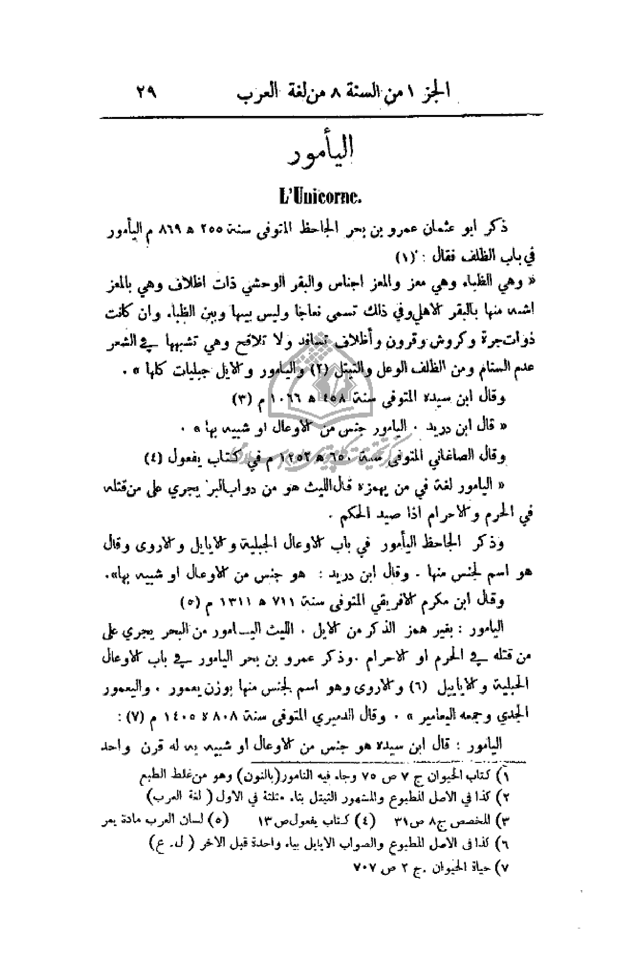 اليأمور: بغير همز الذكر من الأيل، الليث اليأمور من البحر يجري على من قتله في الحرام أو الإحرام. وذكر عمرو بن بحر اليأمور في باب الأوعال الجبلية والأياييل والأروى وهو أسم لجنس منها بوزن يعمور. واليعمور الجدي وجمعه اليعامير). وقال الدميري المتوفي سنة 808هـ 1405م: