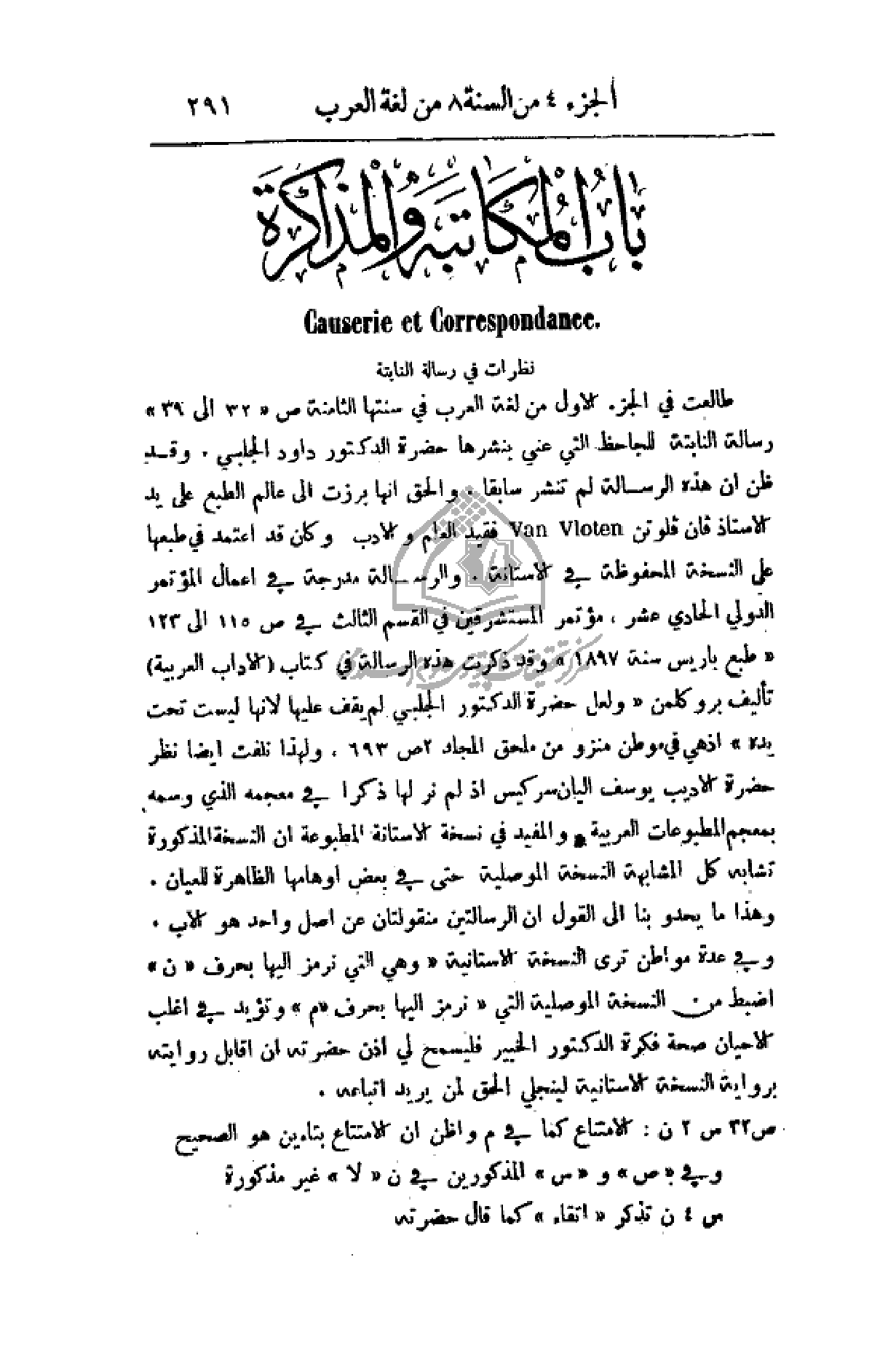 طالعت في الجزء الأول من لغة العرب في سنتها الثامنة ص (32 إلى 39) رسالة النابتة للجاحظ التي عني بنشرها حضرة الدكتور داود الجلبي. وقد ظن أن هذه الرسالة لم تنشر سابقاً. والحق أنها برزت إلى عالم الطبع على يد الأستاذ فان فولتن فقيد العلم والأدب وكان قد اعتمد في طبعها على النسخة المحفوظة في الآستانة. والرسالة مدرجة في أعمال المؤتمر الحادي عشر، مؤتمر المستشرقين في القسم الثالث في ص115 إلى 123 (طبع باريس سنة 1897) وقد ذكرت هذه الرسالة في كتاب (الآداب العربية) تأليف بروكلمن (ولعل حضرة الدكتور الجلبي لم يقف عليها لأنها ليست تحت يده) إذ هي في موطن منزو من ملحق المجلد 2ص 693، ولهذا نلفت أيضاً نظر حضرة الأديب يوسف آليان سركيس إذ لم نر لها ذكراً في معجمه الذي وسمه بمعجم المطبوعات العربية. والمفيد في نسخة الآستانة المطبوعة أن النسخة المذكورة تشابه كل المشابهة النسخة الموصلية حتى في بعض أوهامها الظاهرة للعيان، وهذا ما يحدو بنا إلى القول أن الرسالتين منقولتان عن أصل واحد هو الأب. وفي عدة مواطن ترى النسخة الآستانية (وهي التي نرمز إليها بحرف (ن) أضبط من النسخة الموصلية التي (نرمز إليها بحرف (م) وتؤيد في أغلب الأحيان صحة فكرة الدكتور الخبير فليسمح لي إذن حضرته أن أقابل روايته برواية النسخة الآستانية لينجلي الحق لمن يريد اتباعه.
