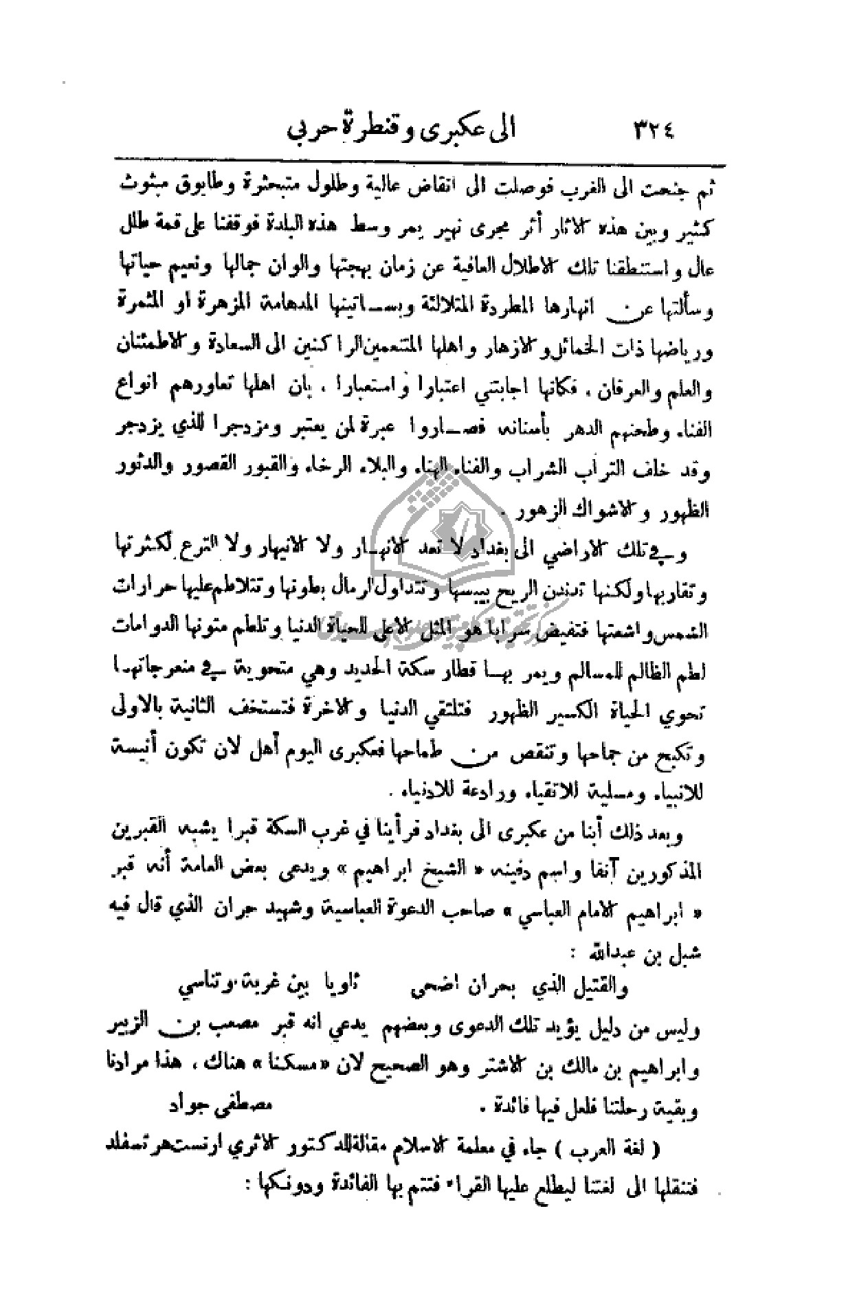 وفي تلك الأراضي إلى بغداد لا تعد الأنهار ولا الأنيهار ولا الترع لكثرتها وتقاربها ولكنها تدندن الريح بيبسها وتتداول الرمال بطونها وتتلاطم عليها حرارات الشمس وأشعتها فتفيض سراباً هو المثل الأعلى للحياة الدنيا وتلطم متونها الدوامات لطم الظالم للمسالم ويمر قطار سكة الحديد وهي متحوية في منعرجاتها تحوي الحياة الكسير الظهور فتلتقي الدنيا والآخرة فتستخف الثانية بالأولى وتكبح من جماحها وتنقص من طماحها فعكبري اليوم أهل لأن تكون أنيسة للأنبياء ومسيلة للأتقياء ورادعة للأدنياء.