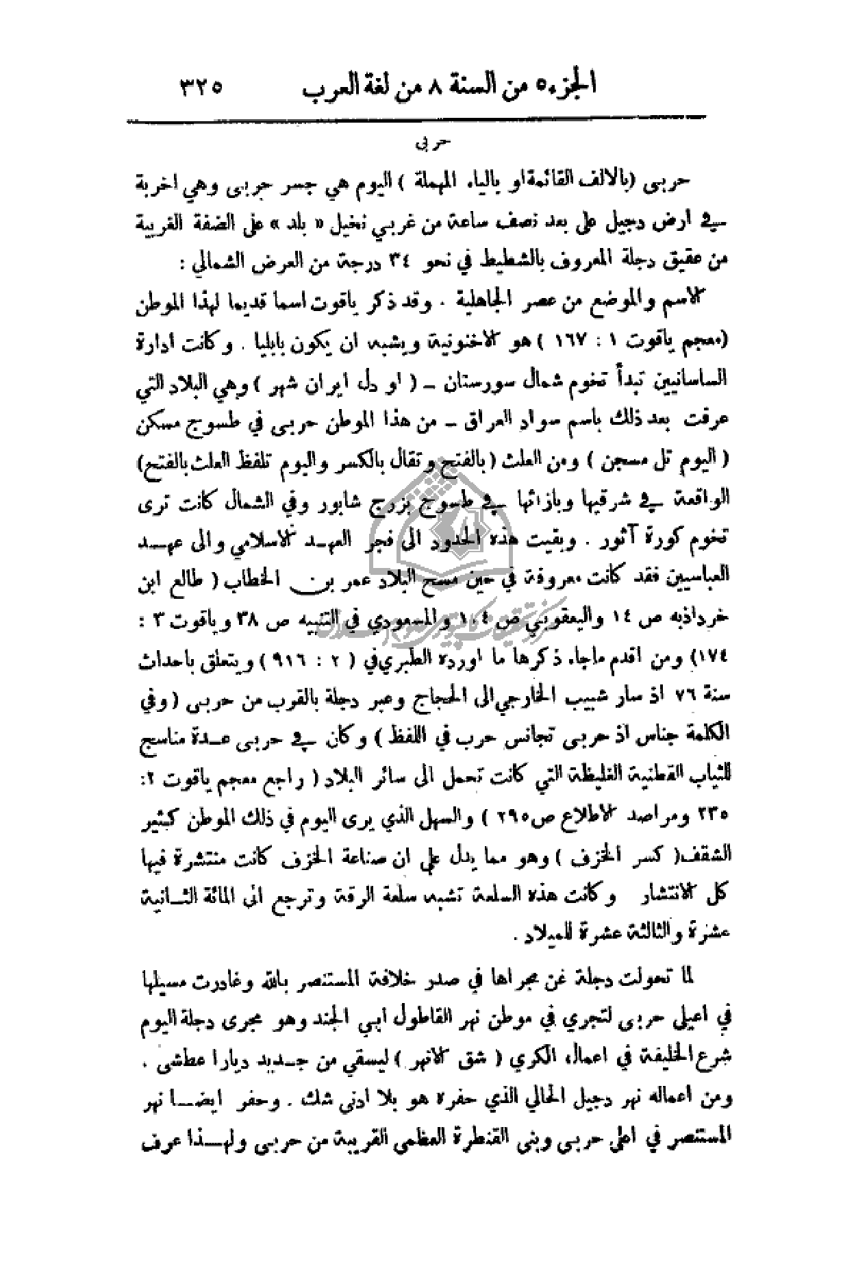 حربي (بالألف القائمة بالياء المهملة) اليوم هي جسر حربي وهي أخربه في أرض دجيل على بعد نصف ساعة من غربي نخيل (بلد) على الضفة الغربية من عقيق دجلة المعروف بالشطيط في نحو 34 درجة من العرض الشمالي: