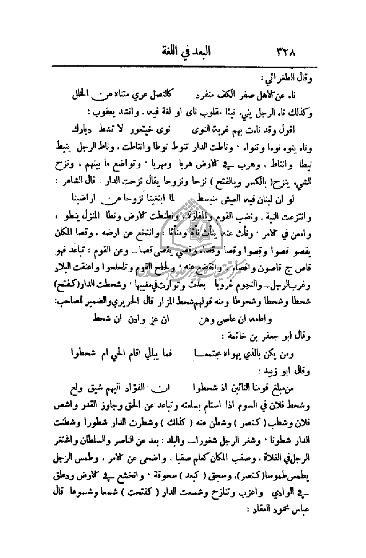 وشحط فلان في السوم إذا استام بسلعة وتباعد عن الحق وجاوز القدر واشص فلان وشطب (كنصر) وشطن عنه (كذلك) وشطرت الدار شطوراً وشطنت الدار شطوناً، وشغر الرجل شغوراً - والبلد: بعد عن الناصر والسلطان واشتغر الرجل في الفلاة، وصقب المكان كعلم صقبا، وأضحى عن الأمر، وطمس الرجل يطمس طموساً (كنصر)، وسحق (كعبد) سحوقه، وانخشع في الأرض ودعلق في الوادي، وأعزب وتنازح وشسعت الدار (كفتحت) شسعاً وشسوعاً قال عباس محمود العقاد: