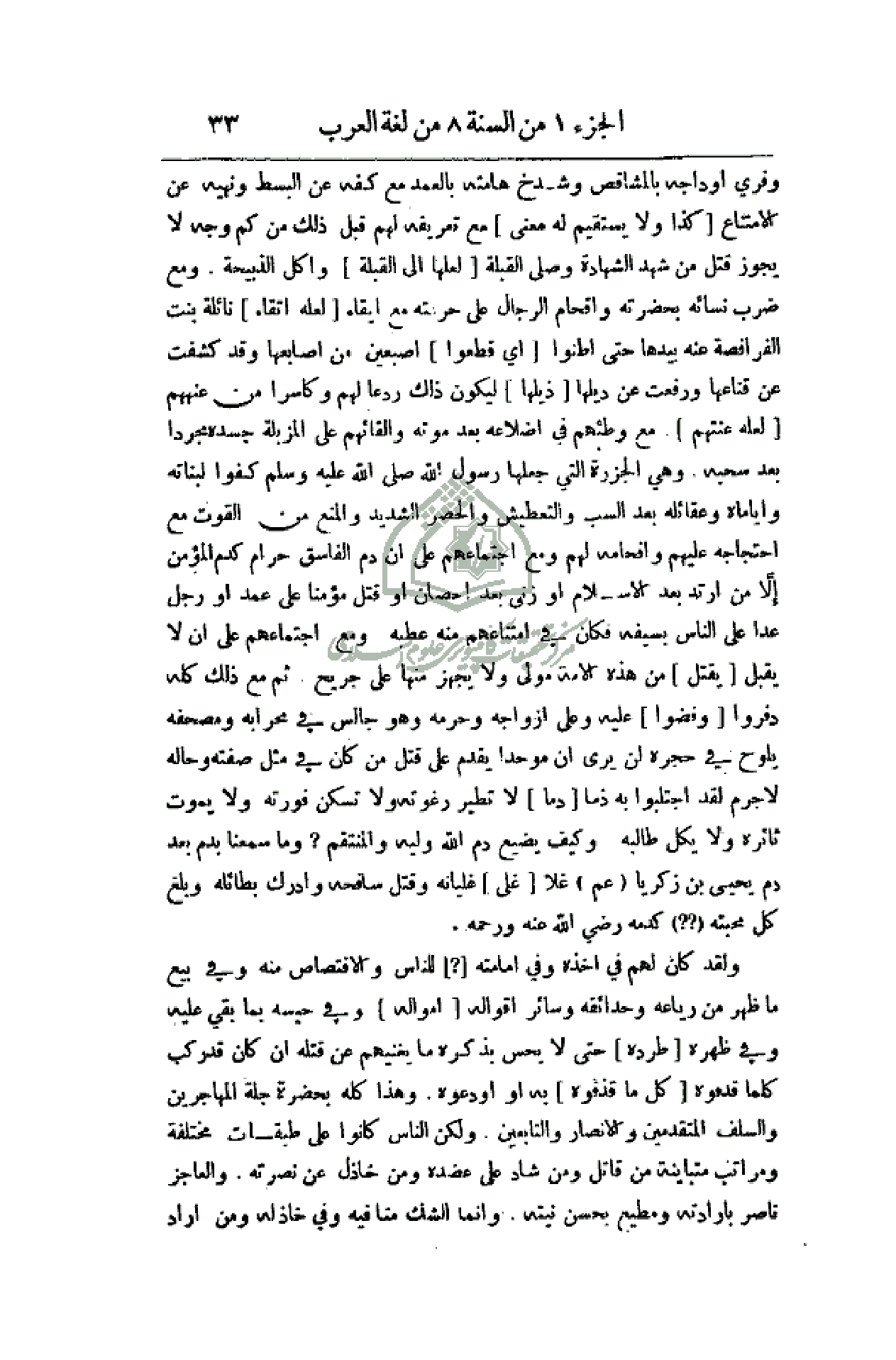 قطعوا) إصبعين من أصابعها وقد كشفت عن قناعها ورفعت عن ديلها (ذيلها) ليكون ذلك ردعاً لهم وكاسراً من (لعله عنتهم) مع وطئهم في أضلاعه بعد موته وإلقائهم على المزبلة بعد سحبه وهي الجزرة التي جعلها رسول الله صلى الله عليه وسلم كفوا وأياماه وعقائله بعد السب والتعطيش والحصر الشديد والمنع من القوت مع احتجاجه عليهم وإفحامه لهم ومع اجتماعهم على أن دم الفاسق حرام كدم المؤمن إلا من أرتد بعد الإسلام أو زنى بعد إحصان أو قتل مؤمنا على عمد أو رجل عدا على الناس بسيفه فكان في امتناعهم منه عطبه ومع اجتماعهم على أن لا يقبل (يقتل) من هذه الأمة مولى ولا يجهز منها على جريح ثم مع ذلك كله دفروا (وفضوا) عليه وعلى أزواجه وحرمه وهو جالس في محرابه ومصحفه يلوح في حجره أن يرى أن موحداً يقدم على قتل من كان في مثل صفته وحاله لا جرم لقد اجتلبوا به ذما (دما) لا تطير رغوته ولا تسكن فورته ولا يموت ثائره ولا يكل طالبه. وكيف يضيع دم الله وليه والمنتقم؟ وما سمعنا بدم بعد دم يحيى بن زكريا (عم) غلا (غلى) غليانه وقتل سافحه وأدرك بطائله وبلغ كل محبته (؟؟) كدمه رضي الله عنه ورحمه.