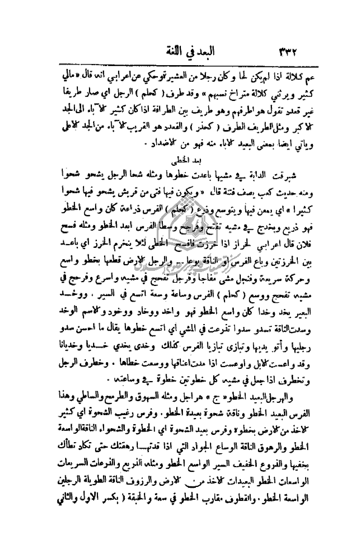 شبرقت الدابة في مشيها باعدت خطوها ومثله شحا الرجل يشحو شحوا ومنه حديث كعب يصف فتنة قال (ويكون فيها فتى من قريش يشحو فيها شحوا كثيراً) أي يمعن فيها ويتوسع وذرع (كحلم) الفرس ذراعة كان واسع الخطو فهو ذريع وبخدج في مشيه تفتح وفرحج وسطاً الفرس ابعد الخطو ومثله فسح ففلان قال أعرابي لخراز إذا خرزت فأفسح الخطى لئلا ينخرم الخرز أي باعد بين الخرزتين وباع الفرس أو الناقى بوعاً - والرجل الأرض قطعها بخطو واسع وحركة سريعة وفنجل مشى مفاجأ وفرجل في مشية وأسرع وفرحج في مشيه تفحج ووسع (كحلم) الفرس وساعة وسعة اتسع في السير، ووخد البعير يخد وخذا كان واسع الخطو فهو واخد ووخاد ووخود الاسم الوخد وسدت الناقة سدوا تذرعت في المشي أي اتسع خطوها يقال ما أحسن سدو جليها وأتو يديها وتبازي تبازيا الفرس كذلك وخذي يخدي خديا وخدايانا وقد واعست الابل واوعست إذا مدت أعناقها ووسعت خطاها. وخطرف الرجل وتخطرف إذا جعل في مشيه كل خطوتين خطوة في ساعته.