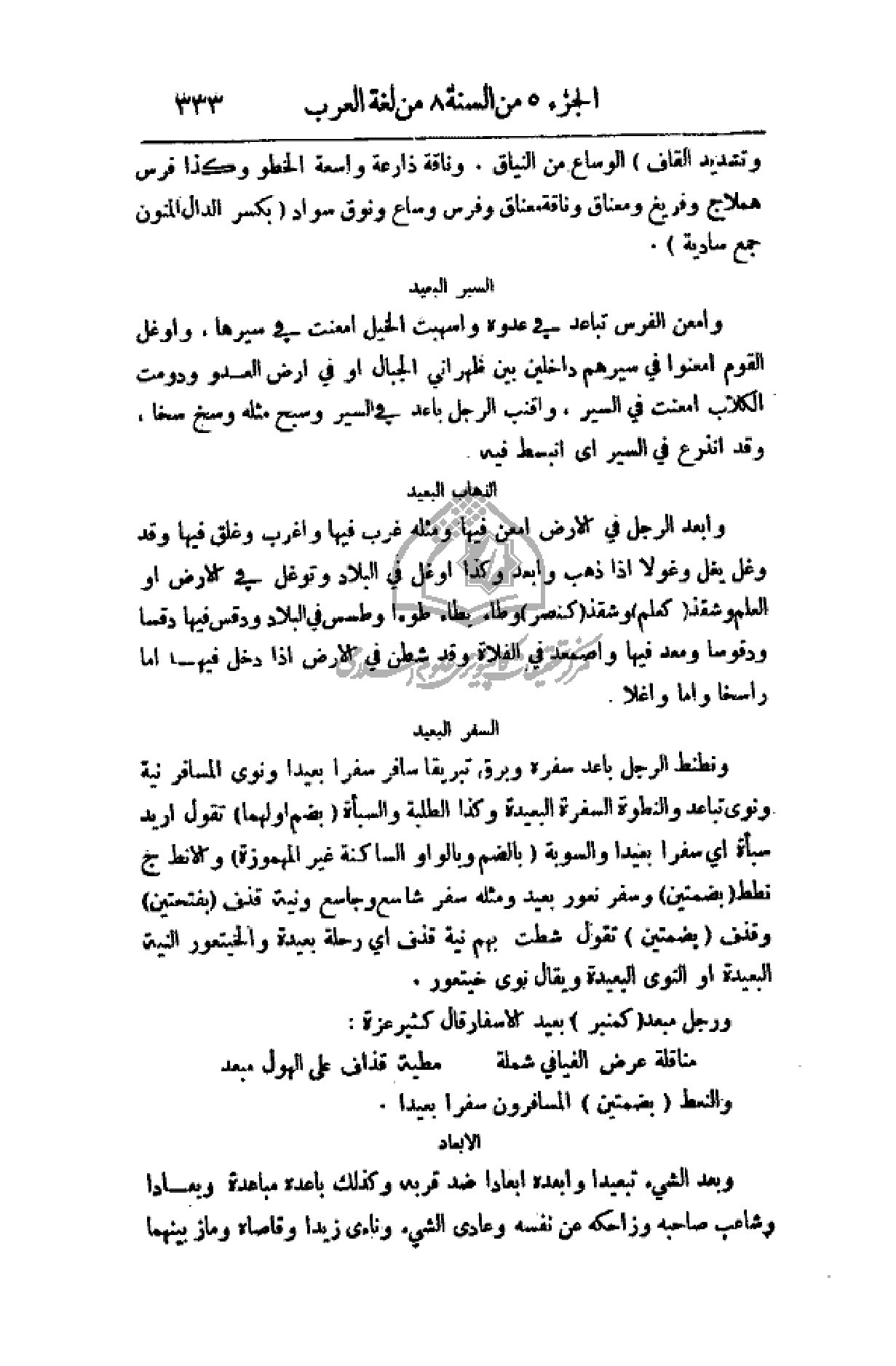 وبعد الشيء تبعيداً وأبعده أبعاداً ضد قربة وكذلك باعده مباعدة وبعاداً وشاعب صاحبه وزاحكه عن نفسه وعادى الشيء وناءى زيداً وقاصاه وماز بينهما