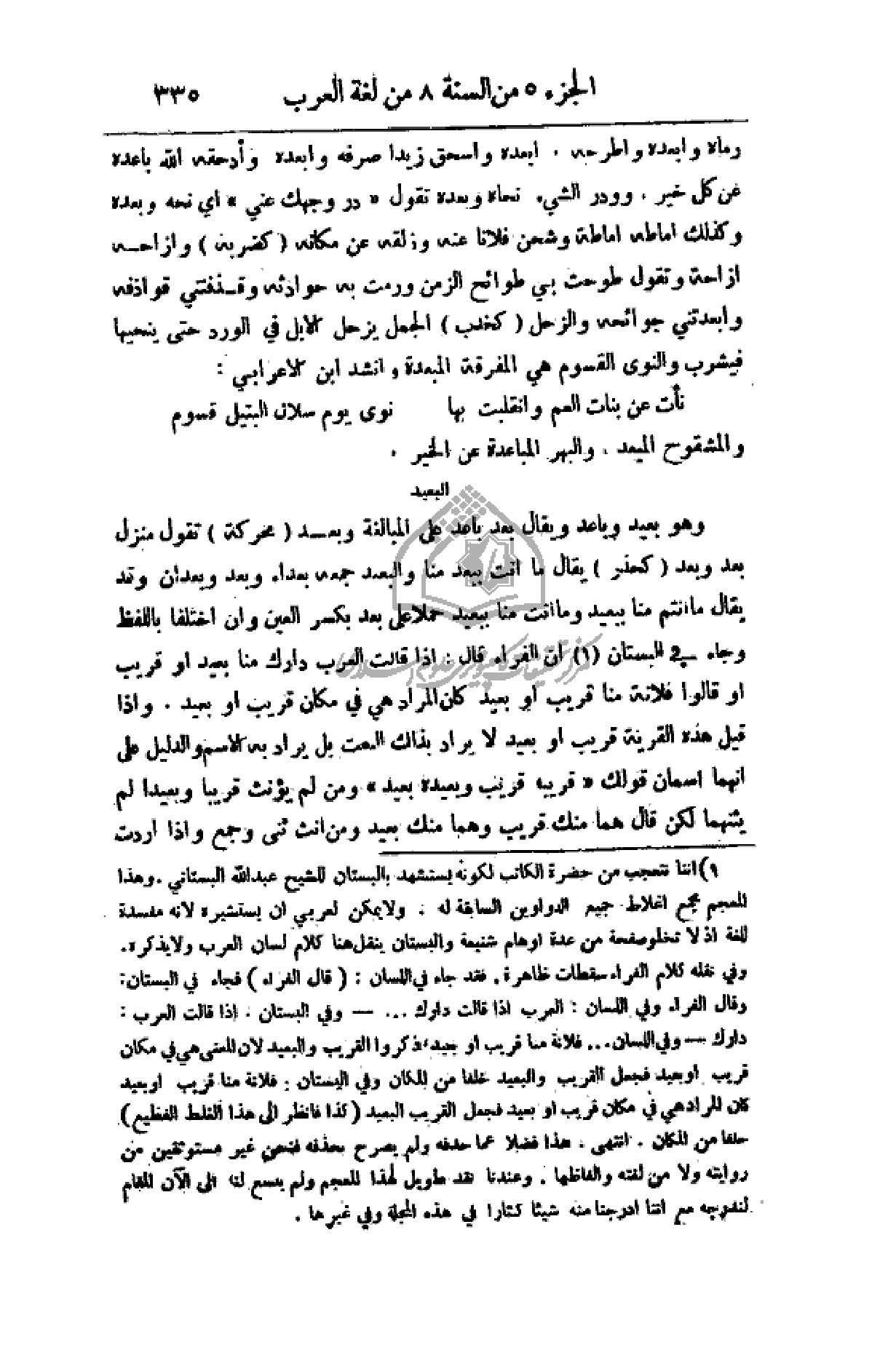 وهو بعيد وباعد ويقال بعد باعد على المبالغة وبعد (محركة) تقول منزل بعد وبعد (كحذر) يقال ما أنت ببعد منا والبعيد جمعة بعداء وبعد وبعدان وقد يقال ما أنتم منا ببعيد وما أنت منا ببعيد حملاً على بعد بكسر العين وأن اختلفا باللفظ وجاء في البستان أن الفراء قال: إذا قالت العرب دارك منا بعيد أو قريب أو قالوا فلانة منا قريب أو بعيد لا يراد بذلك النعت