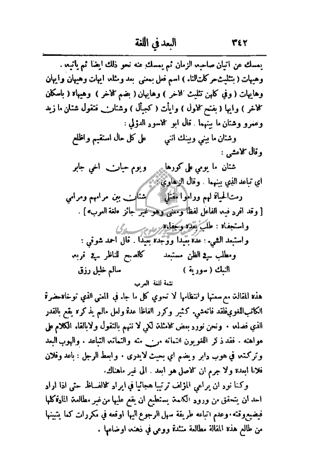 هذه المقالة مع سعتها وانتظامها لا تحتوي كل ما جاء في الذي توخاه حضرة الكاتب اللغوي فلقد فاته شيء كثير وكرر ألفاظاً عدة ولعل ما لم يذكره يقع بالقدر الذي فصله، ونحن نورد بعض الأمثلة لكي لا نتهم بالتقول ولا بإلقاء الكلام على عواهنه. فقد ذكر اللغويون التماته من مته والتماته التباعد. والهوب البعد وتركته في هوب دابر ويضم أي بحيث لا يدري، وابعط الرجل باعد وفلان فلاناً أبعده ولا جرم أن الأصل هو أبعد. إلى غير ما هناك.