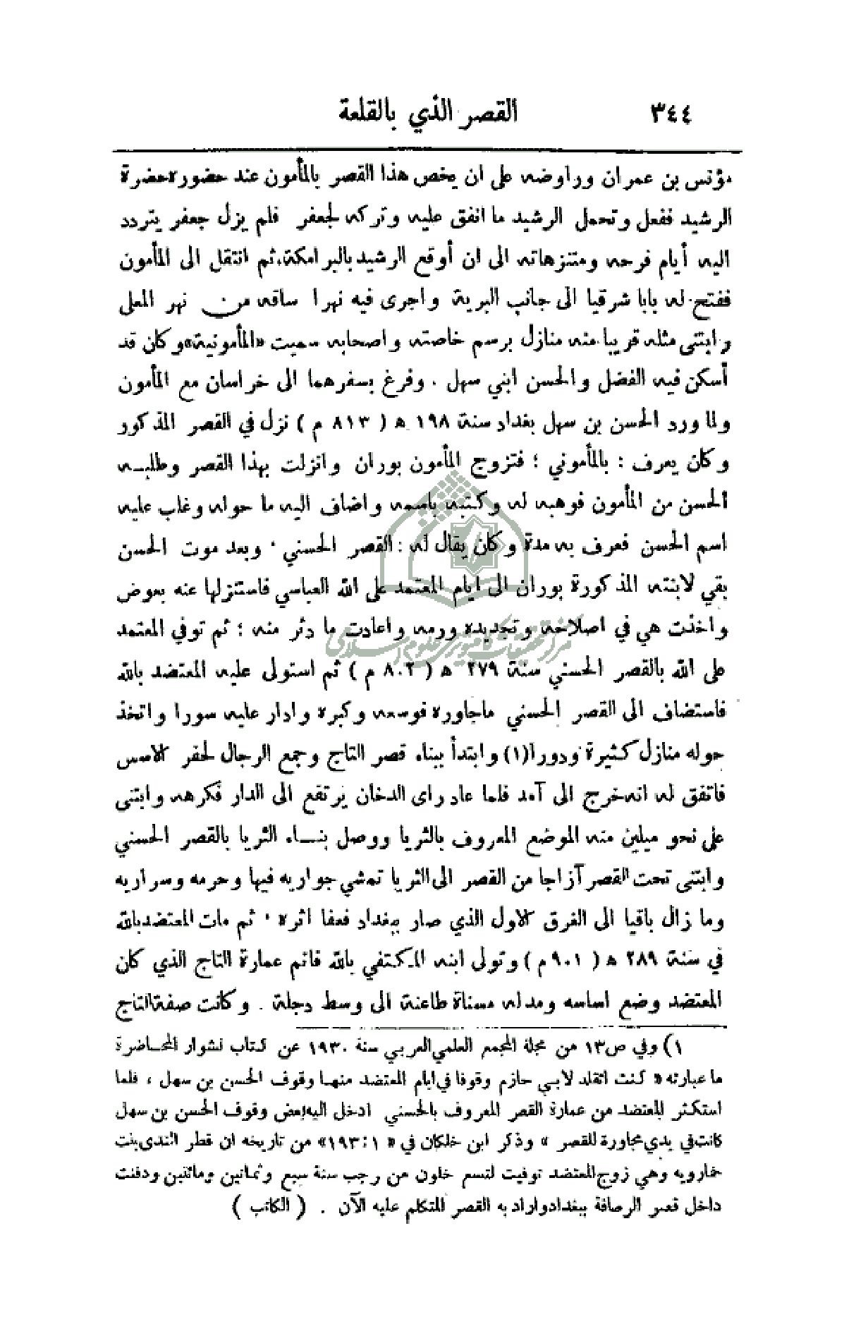 مؤنس بن عمران وراوضه على أن يخص هذا القصر بالمأمون عند حضور حضرة الرشيد ففعل وتحمل الرشيد ما نفق عليه وتركه لجعفر فلم يزل جعفر تتردد إليه أيام فرحه ومتنزهاته إلى أن وقع الرشيد بالبرامكة، ثم أنتقل إلى المأمون ففتح له باباً شرقياً إلى جانب البرية وأجرى فيه نهراً ساقه من نهر المعلي وابتنى مثله قريباً منه منازل برسم خاصته وأصحابه
