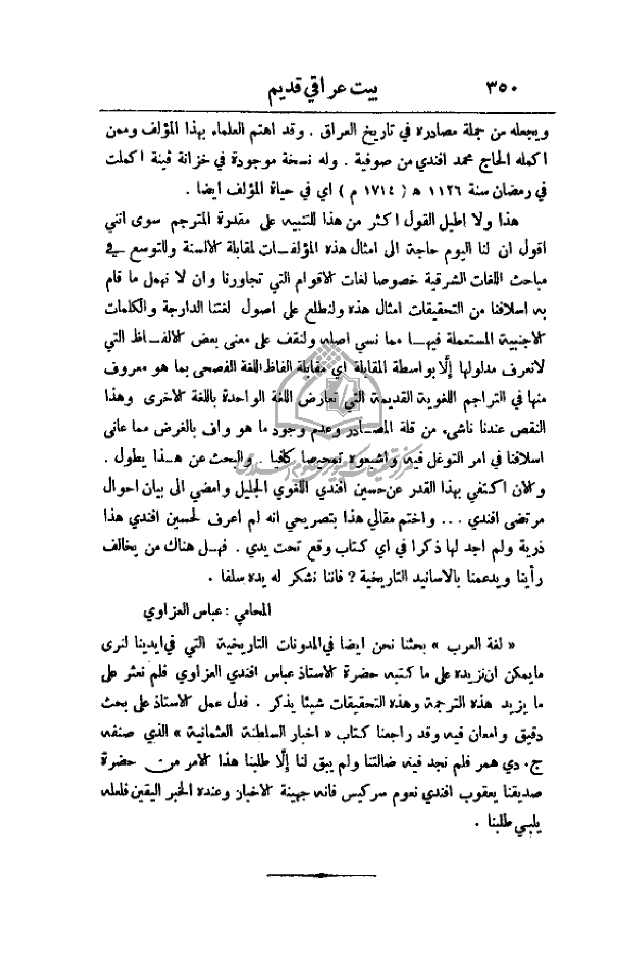 (لغة العرب) بحثنا نحن أيضاً في المدونات التاريخية التي في أيدينا لنرى ما يمكن أن نريده على ما كتبه حضرة الأستاذ عباس أفندي العزاوي فلم نعثر على ما يزيد هذه الترجمة وهذه التحقيقات شيئاً يذكر. فدل عمل الأستاذ على بحث دقيق وإمعان فيه قد راجعنا كتاب (أخبار السلطنة العثمانية) الذي صنفه ج دي همر فلم نجد فيه ضالتنا ولم يبق لنا إلا طلبنا هذا الأمر من حضرة صديقنا يعقوب أفندي نعوم سركيس فأنه جهينة الأخبار وعنده الخبر اليقين فلعله يلبي طلبنا.