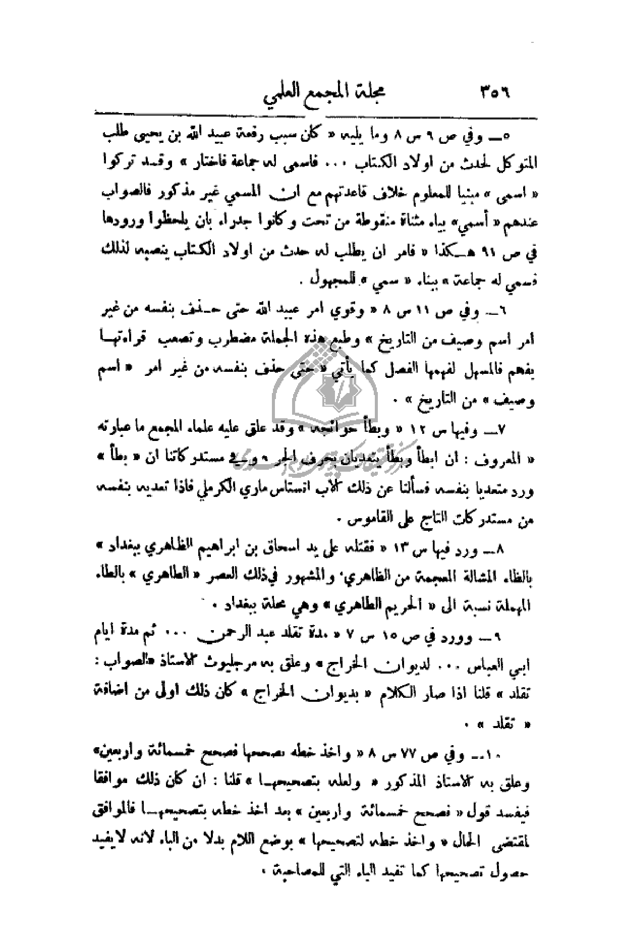 7 - وفيها س 12 (وبطأ حوائجه) وقد علق عليه علماء المجمع ما عبارته (المعروف: أن أبطأ وبطأ يتعديان بحرف الجر وفي مستدر كاتنا أن (بطأ) ورد متعدياً بنفسه فسألنا عن ذلك الأب انستاس ماري الكرملي فإذا تعديه بنفسه من مستدركات التاج على القاموس.