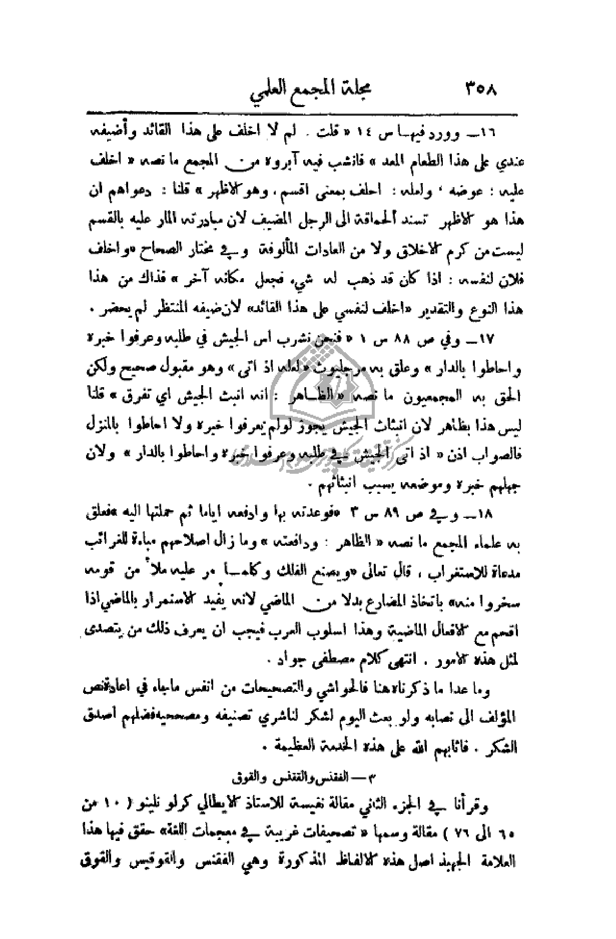 وقرأنا في الجزء الثاني مقالة نفيسة للأستاذ الإيطالي كرلو نلينو (10 من 65 إلى 76) مقالة وسمها (تصحيفات غريبة في معجمات اللغة) حقق فيها هذا العلامة الجهبذ أصل هذه الألفاظ المذكورة وهي الفقنس والقوقيس والقوق