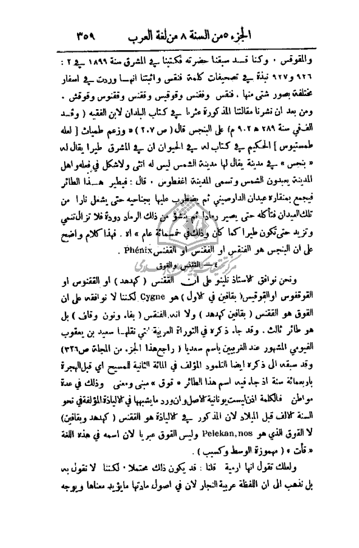 والمقوقس، وكنا قد سبقنا حضرته فكتبنا في المشرق سنة 1899 في 2: 926 و 927 نبذة في تصحيفات كلمة فنقس وأثبتنا أنها وردت في أسفار مختلفة بصور شتى منها، فنقس وفقنس وقوقيس وققنوس وقوقش. ومن بعد أن نشرنا مقالتنا المذكورة عثرنا في كتاب البلدان لأبن الفقيه (وقد ألف في سنة 289هـ 902م) على البنجس قال (ص 207) (وزعم طمياث (لعله طمستيوس) الحكيم في كتاب له في الحيوان أن في المشرق طيراً يقال له (بنجس) في مدينة يقال لها مدينة الشمس ليس له أنثى ولا شكل في فعله وأهل المدينة يعبدون الشمس وتسمى المدينة أغفطوس، قال: فيطير هذا الطائر فيجمع بمنقاره عيدان الدار صيني ثم يضطرب عليها بجناحيه حتى يشعل نارا من تلك العيدان فتأكله حتى يصير رماداً ثم ينشأ من ذلك الرماد دودة فلا تزال تنمي وتزيد حتى تكون طيراً كما كان وذلك في خمسمائة عام) اه. فهذا كلام واضح على أن البنجس هو الفنقس أو الفقنس أو القفنس
