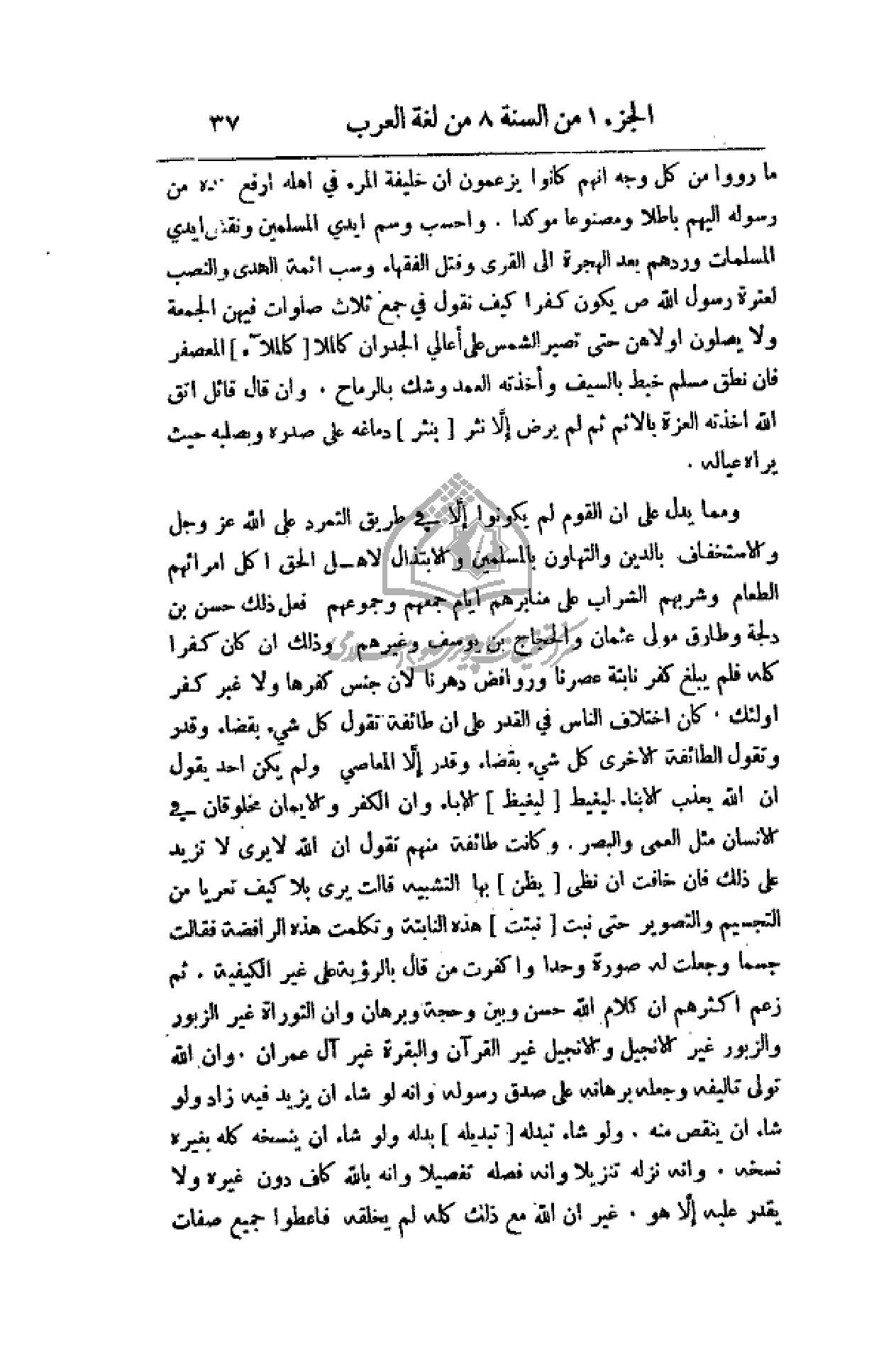 أن نظى (يظن) بها التشبيه قالت يرى بلا كيف تعريا من التجسيم والتصوير حتى نبت (نبتت) هذه النابتة وتكلمت هذه الرافضة فقالت جسما وجعلت له صورة وحدا وأكفرت من قال بالرؤية على غير الكيفية. ثم زعم أكثرهم أن كلام الله حسن وبين وحجة وبرهان وان التوراة غير الزبور والزبور غير الإنجيل والإنجيل غير القرآن والبقرة غير آل عمران. وان الله تولى تأليفه وجعله برهانه على صدق رسوله وانه لو شاء أن يزيد فيه زاد ولو شاء أن ينقص منه. ولو شاء تبدله (تبديله) بدله ولو شاء أن ينسخه كله بغيره نسخه. وانه نزله تنزيلا وانه فصله تفصيلا وانه بالله كاف دون غيره ولا يقدر عليه إلا هو. عير أن الله مع ذلك كله لم يخلقه فأعطوا جميع صفات