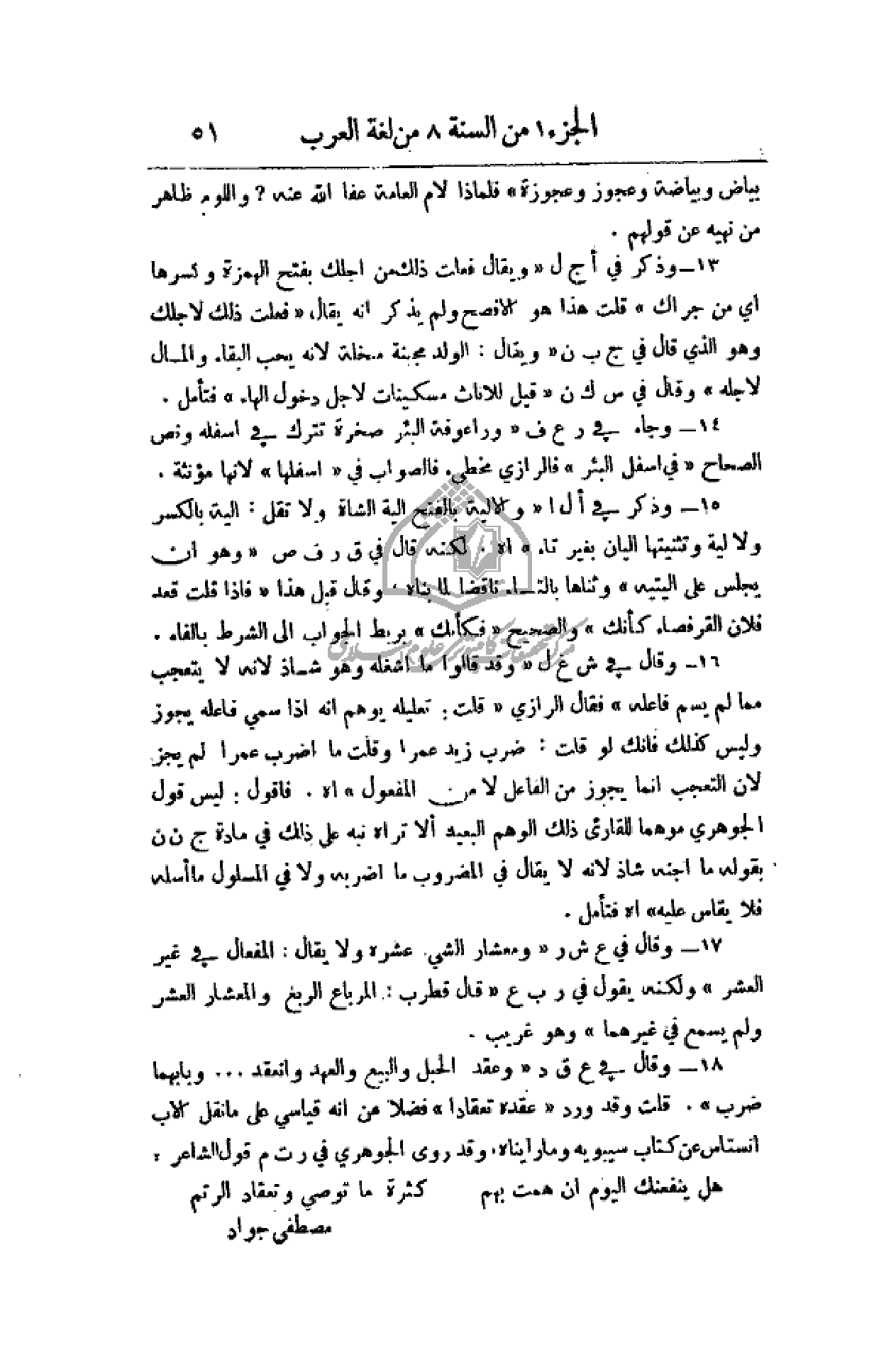 16 - وقال في ش غ ل (وقد قالوا ما أشغله وهو شاذ لأنه لا يتعجب مما لم يسم فاعله) فقال الرازي (قلت: تعليله يوهم أنه إذا سمي فاعله يجوز وليس كذلك فأنك لو قلت: ضرب زيد عمراً وقلت ما اضرب عمراً لم يجز لأن التعجب إنما يجوز من الفاعل لا من المفعول) فأقول: ليس قول الجوهري موهماً للقارئ ذلك الوهم البعيد ألا تراه نبه على ذلك في مادة ج ن ن بقوله ما أجنه شاذ لأنه لا يقال في المضروب ما أضربه ولا في المسلول ما أسله فلا يقاس عليه.