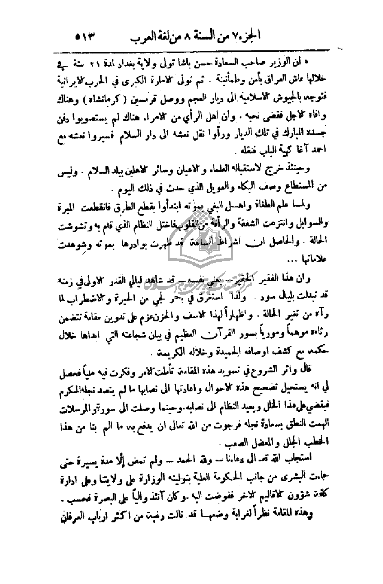 وان هذا الفقير الحقير - يعني نفسه - قد شاهد ليالي القدر الأولى في زمانه قد تبدلت بليال سود، ولذا استغرق في بحر لجي من الحيرة والاضطراب لما رآه من تغير الحالة، وإظهاراً لهذا الأسف والحزن عزم على تدوين مقامة تتضمن رثاءه موهماً ومورياً بسور القرآن العظيم في بيان شجاعته التي أبداها خلال حكمه مع كشف أوصافه الحميدة وخلاله الكريمة.