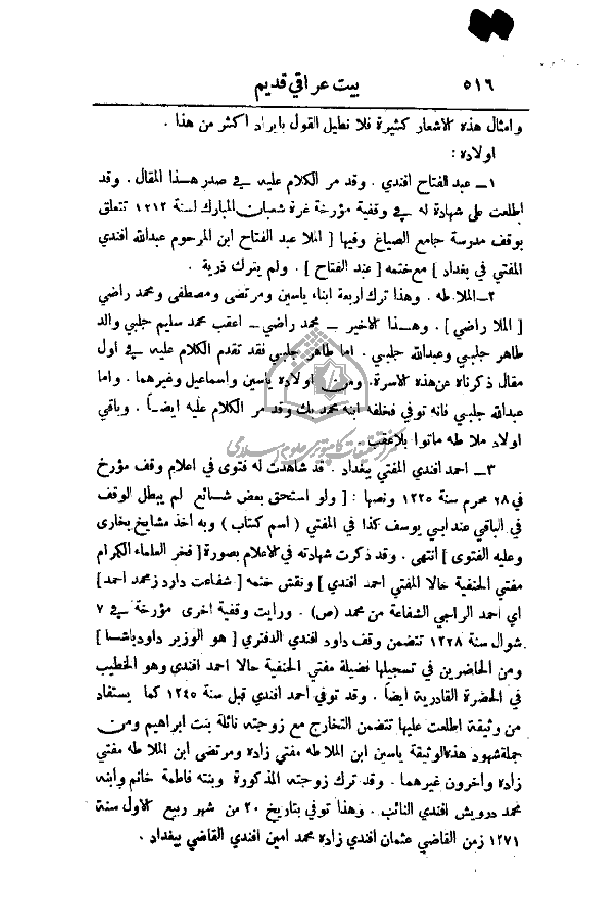 3 - احمد أفندي المفتي ببغداد. قد شاهدت له فنوى في أعلام وقف مؤرخ في 28 محرم سنة 1225 ونصها: (ول استحق بعض شائع لم يبطل الوقف في الباقي عند أبي يوسف كذا في المفتي (اسم كتاب) وبه اخذ مشايخ بخاري وعليه الفتوى) انتهى. وقد ذكرت شهادته في الأعلام بصورة (فخر العلماء الكرام مفتي الحنفية حالا المفتي احمد أفندي) ونقش ختمه (شفاعت داردز محمد احمد) أي احمد الراجي الشفاعة من محمد (ص). ورأيت وقفية أخرى مؤرخة في 7 شوال سنة 1228 تتضمن وقف داود أفندي الدفتري (هو الوزير داود باشا) ومن الحاضرين في تسجيلها فضيلة مفتي الحنفية حالا احمد أفندي وهو الخطيب في الحضرة القادرية أيضاً. وقد توفي احمد أفندي قبل سنة 1245 كما يستفاد من وثيقة اطلعت عليها تتضمن التخارج مع زوجته نائلة بنت إبراهيم ومن جملة شهود هذه الوثيقة ياسين ابن الملا طه مفتي زاده ومرتضى ابن الملا طه مفتي زاده وآخرون غيرهما. وقد ترك زوجته المذكورة وبنته فاطمة خانم وابنه محمد درويش أفندي النائب، وهذا توفي بتاريخ 20 من شهر ربيع الأول سنة 1271 زمن القاضي عثمان أفندي زاده محمد أمين أفندي القاضي ببغداد.
