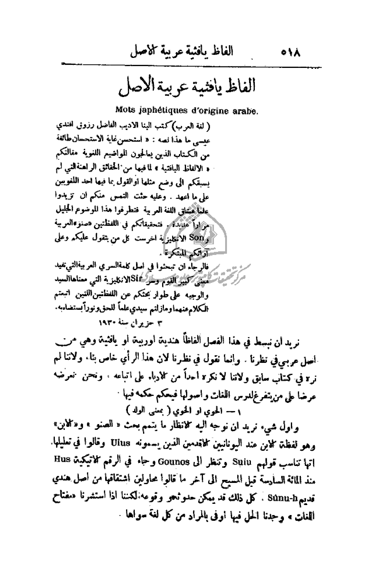 نريد أن نبسط في هذا الفصل ألفاظاً هندية أوربية أو يافثية وهي من أصل عربي في نظرنا، وإنما نقول في نظرنا لان هذا الرأي خاص بنا، ولأننا لم نره في كتاب سابق ولأننا لا نكره أحداً من الأدباء على اتباعه، ونحن نعرضه عرضا على من يتفرغ لدرس اللغات وأصولها فيحكم حكمه فيها.