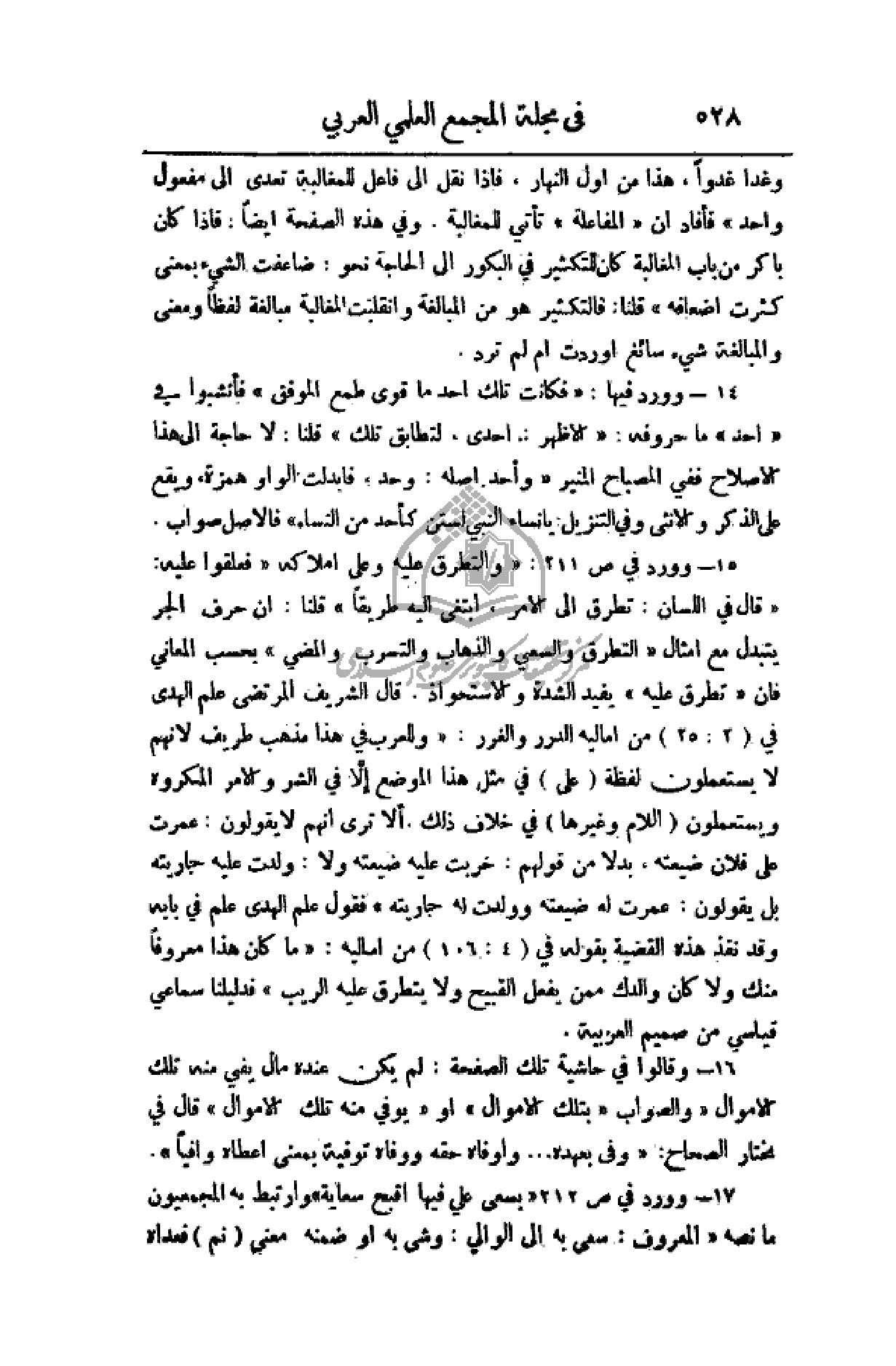 وغدا غدواً، هذا من أول النهار، فإذا نقل إلى فاعل للمغالبة تعدى إلى مفعول واحد) فأفاد أن (المفاعلة) تأتي للمغالبة. وفي هذه الصفحة أيضاً: فإذا كان باكر من باب المغالبة كان للتكثير في البكور إلى الحاجة نحو: ضاعفت الشيء بمعنى كثرت أضعافه) قلنا: فالتكثير هو من المبالغة وانقلبت المغالبة مبالغة لفظاً ومعنى والمبالغة شيء سائغ أوردت أم لم ترد.