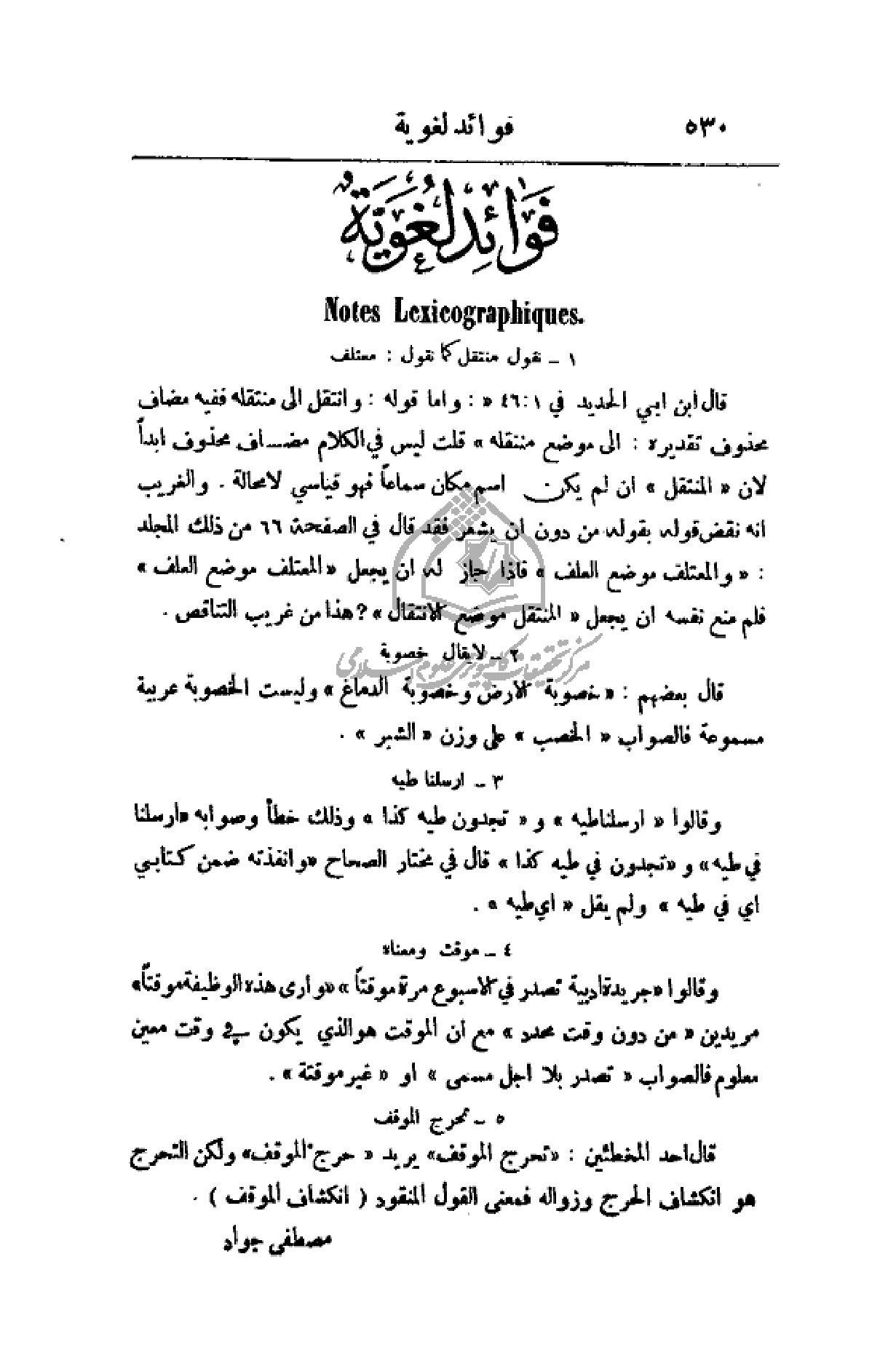 قال ابن أبي الحديد في 46: 1 (: وأما قوله: وانتقل إلى منتقله ففيه مضاف محذوف تقديره: إلى موضع منتقله) قلت ليس في الكلام مضاف محذوف أبداً لأن (المنتقل) أن لم يكن اسم مكان سماعاً فهو قياسي لا محالة. والغريب أنه نقض قوله بقوله من دون أن يشعر فقد قال في الصفحة 66 من ذلك المجلد: (والمعتلف موضع العلف) فإذا جاز له أن يجعل (المعتلف موضع العلف) فلم منع نفسه أن يجعل (المنتقل موضع الانتقال)؟ هذا من غريب التناقض.