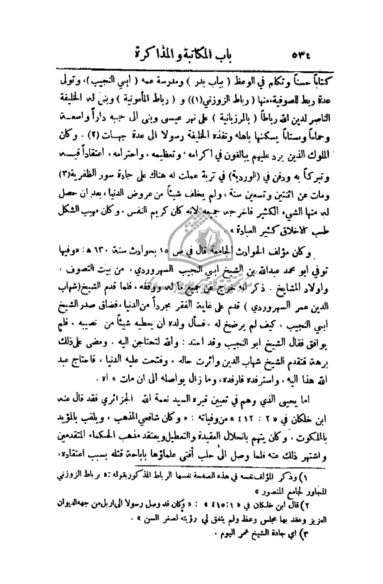 وكان مؤلف الحوادث الجامعة قال في ص15 بحوادث سنة 630هـ: (وفيها توفي أبو محمد عبد الله بن الشيخ أبي النجيب السهروردي. من بيت التصوف. وأولاد المشايخ. ذكر أنه خرج عن جميع ما له ووقفه. فلما قدم الشيخ (شهاب الدين عمر السهروردي) قدم على غاية الفقر مجرداً من الدنيا، فضاق صدر الشيخ أبي النجيب. كيف لم يرضخ له. فسأل ولده أن يعطيه شيئاً من نصيبه، فلم يوافق فقال الشيخ أبو النجيب وقد احتد: والله لتحتاجن إليه. ومضى على ذلك برهة فتقدم الشيخ شهاب الدين وأثرت حاله، وفتحت عليه الدنيا، فاحتاج عبد الله هذا إليه، واسترفده فأرفده. وما زال يواصله حتى مات).