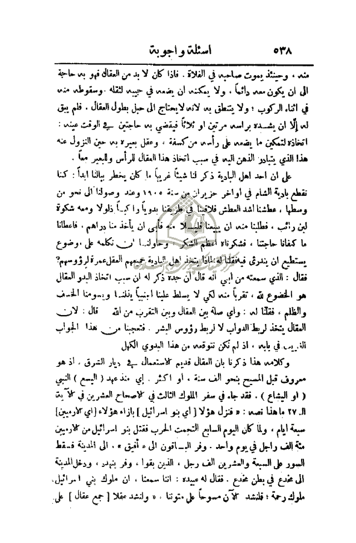 في أواخر حزيران من سنة 1905 وعند وصولنا إلى نحو من وسطها، عطشنا أشد العطش فلاقينا في طريقنا بدوياً راكبا ذلولا ومعه شكوة لبن رائب. فطلبنا منه أن يبيعنا قليلاً منه فأبى أن يأخذ منا دراهم. فأعطانا ما كفانا حاجتنا، فشكرناه أعظم الشكر، وحاولنا أن نكلمه على موضوع يستطيع أن يندرئ فيه فقلنا له: لماذا يتخذ أهل البادية جميعهم العقل عمرة لرؤوسهم؟ فقال: الذي سمعته من أبي أنه قال أن جده ذكر له أن سبب اتخاذ البدو العقال هو الخضوع لله، تقرباً منه لكي لا يسلط علينا أجنبياً يذلنا ويسومنا الخسف والظلم. فقلنا له: وأي صلة بين العقال وبين التقرب من الله. قال: لأن العقال يتخذ لربط الدواب لا لربط رؤوس البشر. فتعجبنا من هذا الجواب الغريب في باب، إذ لم نكن نتوقعه من هذا البدوي الكهل.