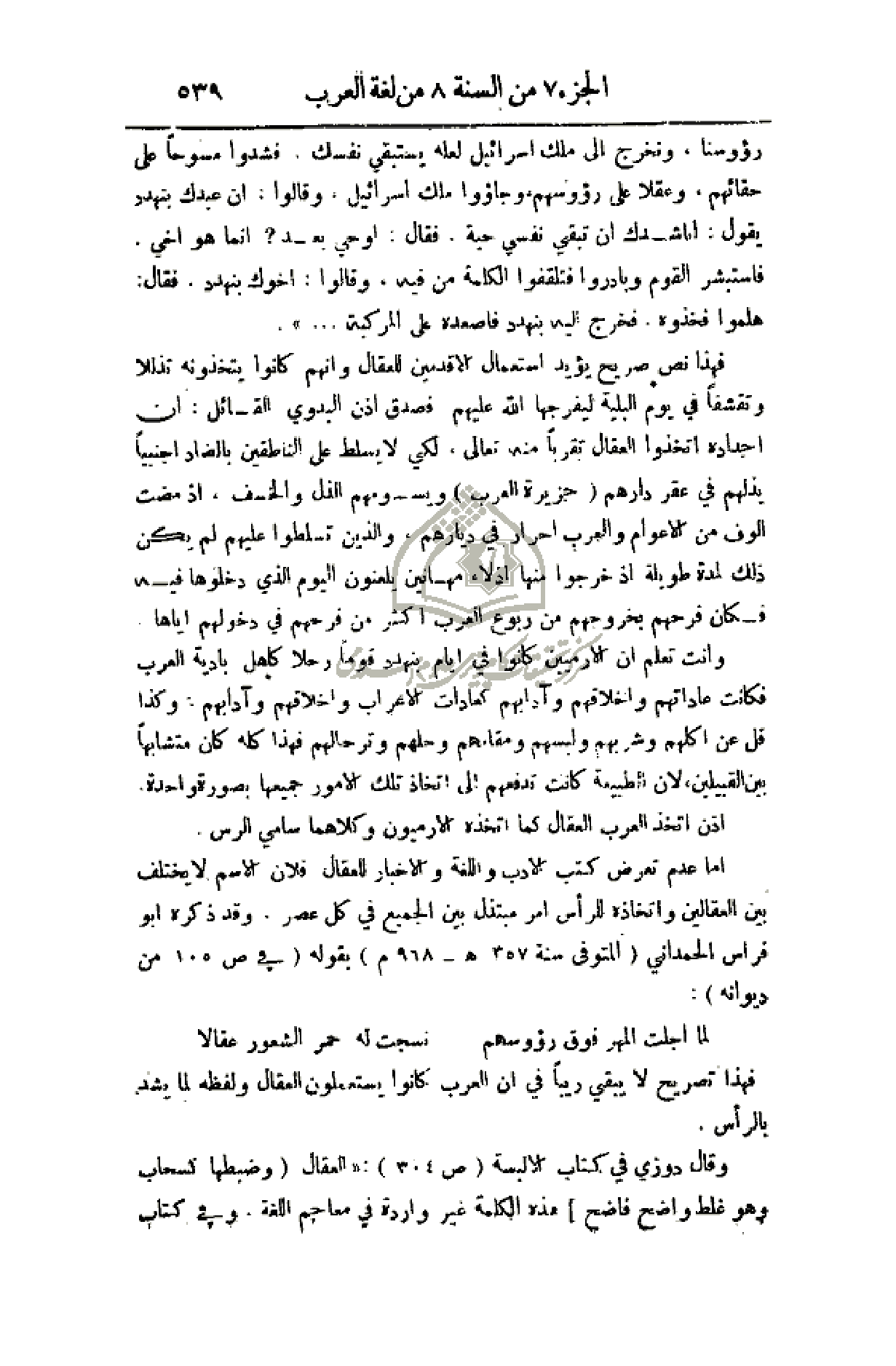 أما عدم تعرض كتب الأدب واللغة والأخبار للعقال فلأن الاسم لا يختلف بين العقالين واتخاذه للرأس أمر مبتذل بين الجميع في كل عصر. وقد ذكره أبو فراس الحمداني (المتوفي سنة 357هـ - 968م) بقوله (في ص105 من ديوانه):
