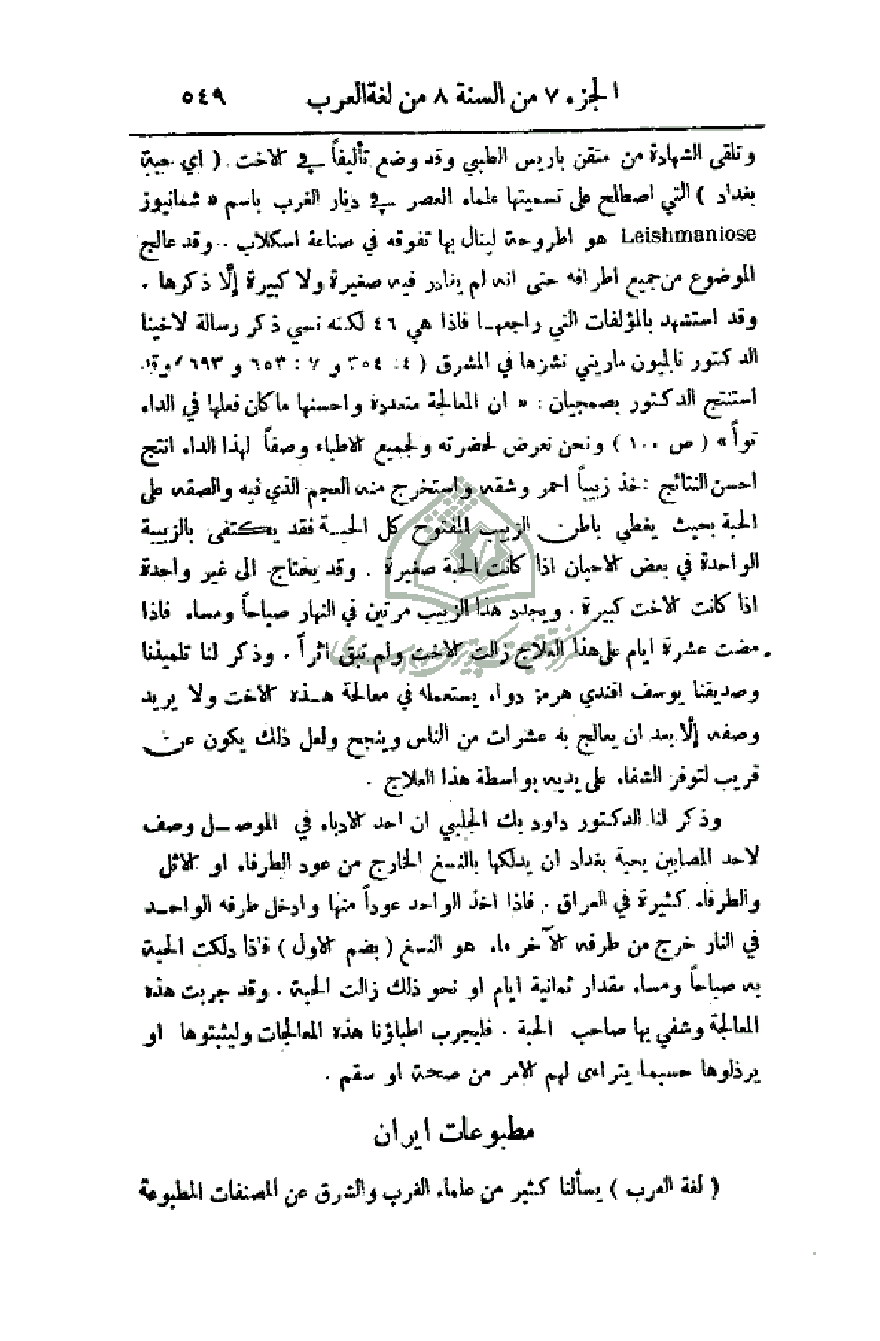 وتلقى الشهادة من متقن باريس الطبي وقد وضع تأليفاً في الأخت (أي حبة بغداد) التي اصطلح علة تسميتها علماء العصر في ديار الغرب باسم (شمانيوز هو أطروحة لينال بها تفوقه في صناعة اسكلاب. وقد عالج الموضوع من جميع أطرافه حتى أنه لم يغادر فيه صغيرة ولا كبيرة إلا ذكرها. وقد استشهد بالمؤلفات التي راجعها فإذا هي 46 لكنه نسي ذكر رسالة لأخينا الدكتور نابليون ماريني نشرها في المشرق (354: 4 و653: 7 و693) وقد استنتج الدكتور بصمجيان: (أن المعالجة متعددة وأحسنها ما كان فعلها في الداء تواً) (ص100) ونحن نعرض لحضرته ولجميع الأطباء وصفاً لهذا الداء أنتج أحسن النتائج: خذ زبيباً أحمر وشقه واستخرج منه العجم الذي فيه والصفة على الحبة بحيث يغطي باطن الزبيب المفتوح كل الحبة فقد يكتفي بالزبيبة الواحدة في بعض الأحيان إذا كانت الحبة صغيرة. وقد يحتاج إلى غير واحدة إذا كانت الأخت كبيرة. ويجدد هذا الزبيب مرتين في النهار صباحاً ومساءاً فإذا مضت عشرة أيام على هذا العلاج زالت الأخت ولم تبق أثراً. وذكر تلميذ لنا تلميذنا وصديقنا يوسف أفندي هرمز دواء يستعمله في معالجة هذه الأخت ولا يريد وصفه إلا بعد أن يعالج عشرات من الناس وينجح ولعل ذلك يكون عن قريب لتوفر الشفاء على يديه بواسطة هذا العلاج.
