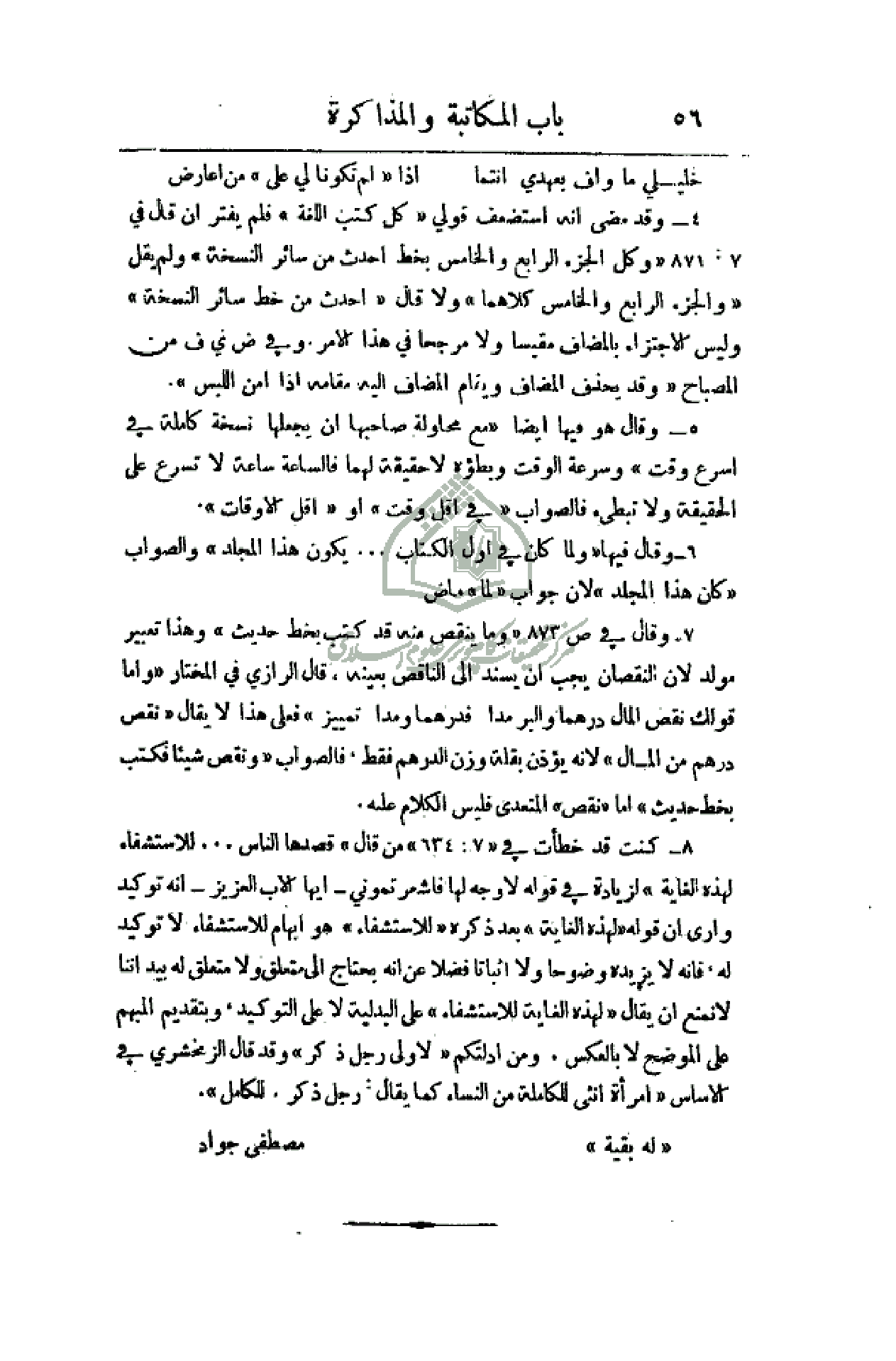 7 - وقال في ص873 (وما ينقص منه قد كتب بخط حديث) وهذا تعبير مولد لأن النقصان يجب أن يسند إلى الناقص بعينه، قال الرازي في المختار (وأما قولك نقص في المال درهماً والبر مدا فدرهماً ومدا تمييز) فعلى هذا لا يقال (نقص درهم في المال) لأنه يؤذن بقلة وزن الدرهم فقط فالصواب (ونقص شيئاً فكتب بخط حديث) أما (نقص) المتعدي فليس الكلام عليه.