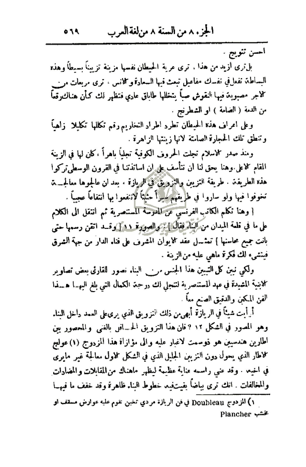 أرأيت شيئاً في الريازة أبهى من ذلك التزويق الذي يرى على العمد داخل البناء وهو المصور في الشكل 12؟ فان هذا التزويق الحافل بالغنى والمحصور بين إطارين هندسيين هو ذوسمت لا غبار عليه وإلى موازاة هذا المزدوج عولج الإطار الذي يحول دون التزيين الجليل الذي في الشكل الأول معالجة غير ما يرى في أخيه. وقد عني رأسه عناية عظيمة ليظهر ما هناك من المقابلات والمضادات والمخالفات.؟ أنك ترى بياضاً بقيت فيه خطوط البناء ظاهرة وقد خفف ما فيها