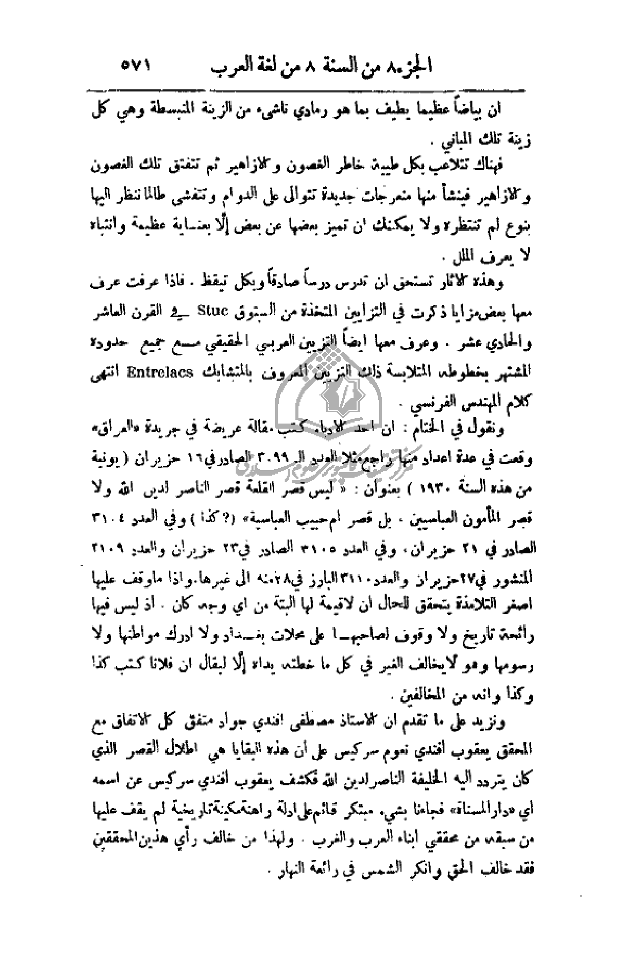 وهذه الآثار تستحق أن تدرس صادقاً وبكل تيقظ. فإذا عرفت عرف معها بعض مزايا ذكرت في التزايين المتخذة من الستوق في القرن العاشر والحادي عشر. وعرف معها أيضاً التزيين العربي الحقيقي مع جميع حدوده المشتهر بخطوطه المتلابسة ذلك التزيين المعروف بالمتشابك انتهى كلام المهندس الفرنسي.
