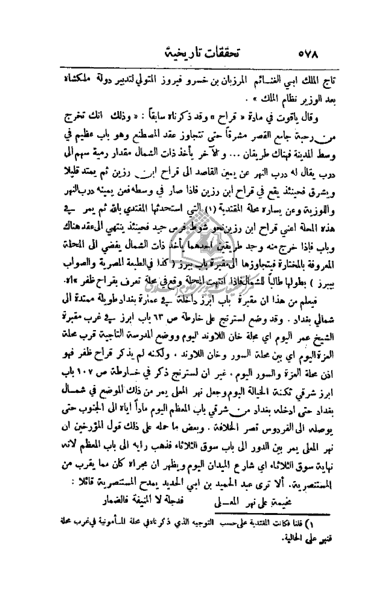 والآخر يأخذ ذات الشمال مقدار رمية سهم إلى درب يقال له درب النهر عن يمين القاصد إلى قراح أبن رزين ثم يمتد قليلاً ويشرق فحينئذ يقع في قراح أبن رزين فإذا صار في وسطه فعن يمينه درب النهر واللوزية وعن يساره محلة المقتدية التي استحدثها المقتدي بالله ثم يمر في هذه المحلة أعني قراح أبن رزين شوط فرس جيد فحينئذ ينتهي إلى عقد هناك وباب فإذا خرج منه وجد طريقين أحدهما يأخذ ذات الشمال يفضي إلى المحلة المعروفة بالمختارة فيتجاوزها إلى مقبرة باب بيرز (كذا في الطبعة المصرية والصواب بيبرز) بطولها طالباً للشمال فإذا انتهت المحلة وقع في محلة تعرف بقراح ظفر) اهـ.