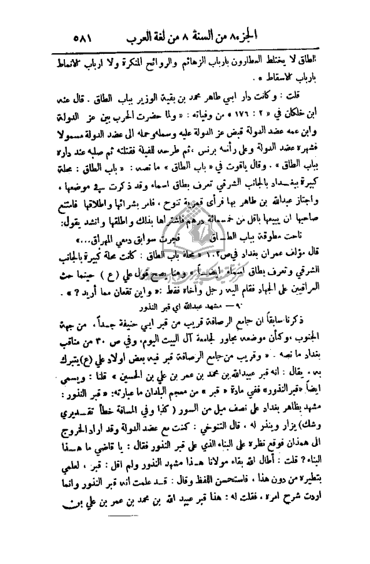 قلت: وكانت دار أبي طاهر محمد بن بقية الوزير بباب الطاق. قال عنه أبن خلكان في (2: 176) من وفياته: (ولما حضرت الحرب بين عز الدولة وابن عمه عضد الدولة قبض عز الدولة عليه وسمله وحمله إلى عضد الدولة مسمولا فشهره عضد الدولة وعلى رأسه برنس، ثم طرحه للفيلة فقتلته ثم صلبه عند داره بباب الطاق). وقال ياقوت في (باب الطاق) وما نصه: (باب الطاق: محلة كبيرة ببغداد بالجانب الشرقي تعرف بطاق أسماء وقد ذكرت في موضعها، واجتاز عبد الله بن طاهر بها فرأى قمرية تنوح، فأمر بشرائها وإطلاقها فامتنع صاحبها أن يبيعها بأقل من خمسمائة درهم فاشتراها بذلك وأطلقها وأنشد يقول: