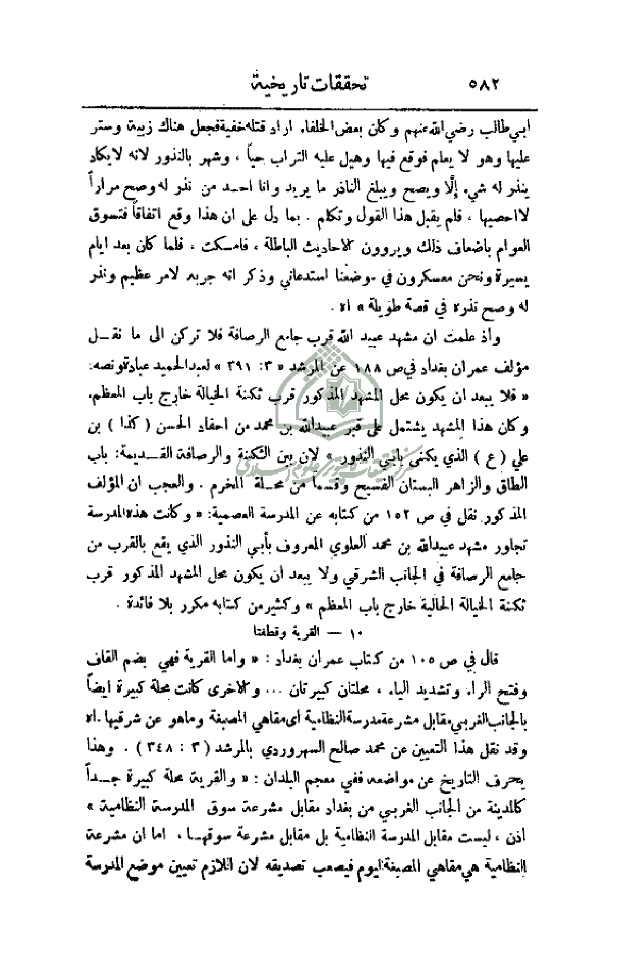 قال في ص 105 من كتاب عمران بغداد: (وأما القرية فهي بضم القاف وفتح الراء وتشديد الياء، محلتان كبيرتان. . . والأخرى كانت محلة كبيرة أيضاً بالجانب الغربي مقابل