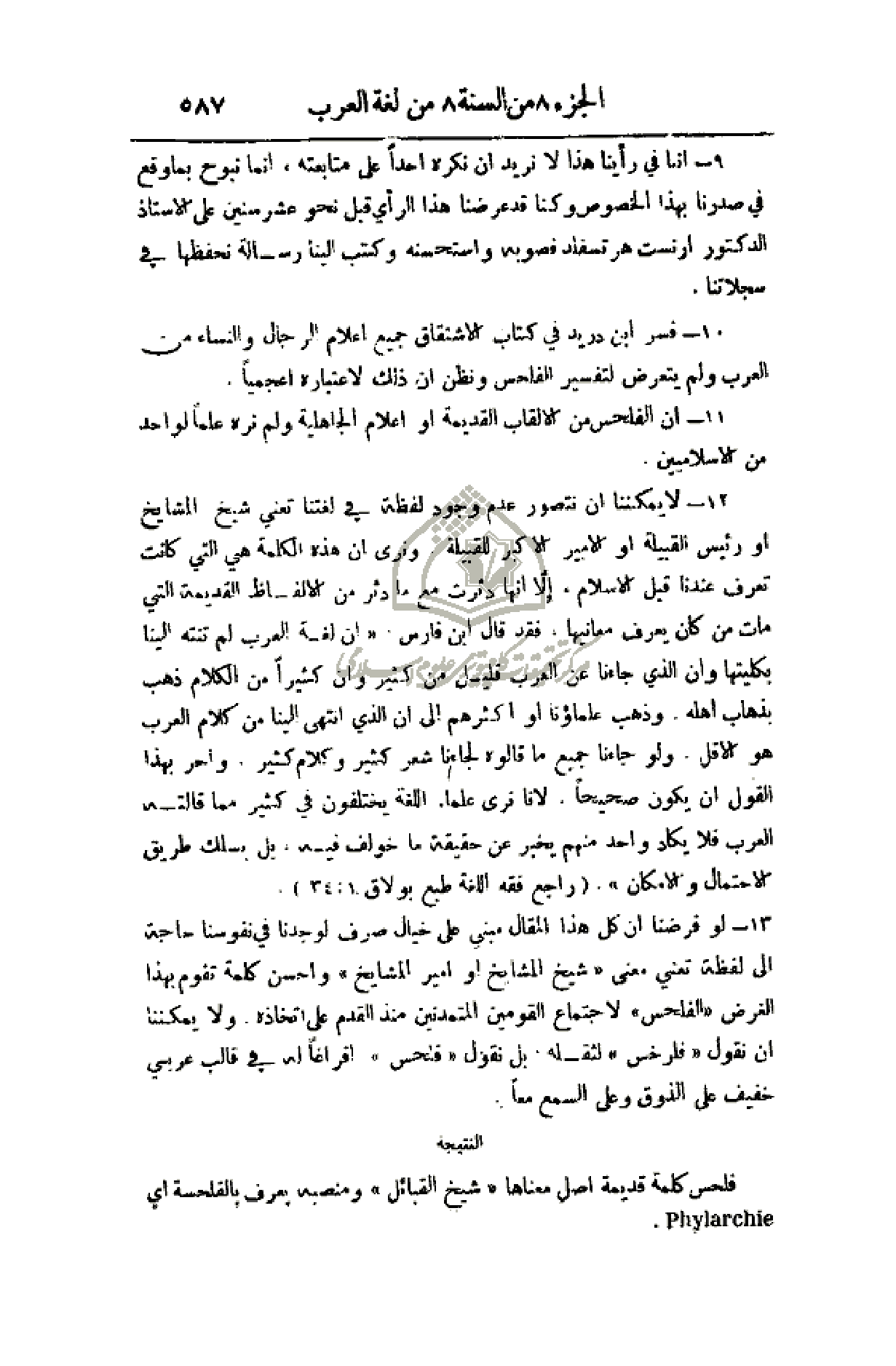 13 - لو فرضنا أن كل هذا المقال مبني على خيال صرف لوجدنا في نفوسنا حاجة إلى لفظة تعني معنى (شيخ المشايخ أو أمير المشايخ) وأحسن كلمة تقوم بهذا الغرض (الفلحس) لاجتماع القوميين المتمدنين منذ القدم على اتخاذه ولا يمكننا أن نقول (فلرخس) لثقله بل نقول (فلحس) إفراغاً له في قالب عربي خفيف على الذوق وعلى السمع معاً.