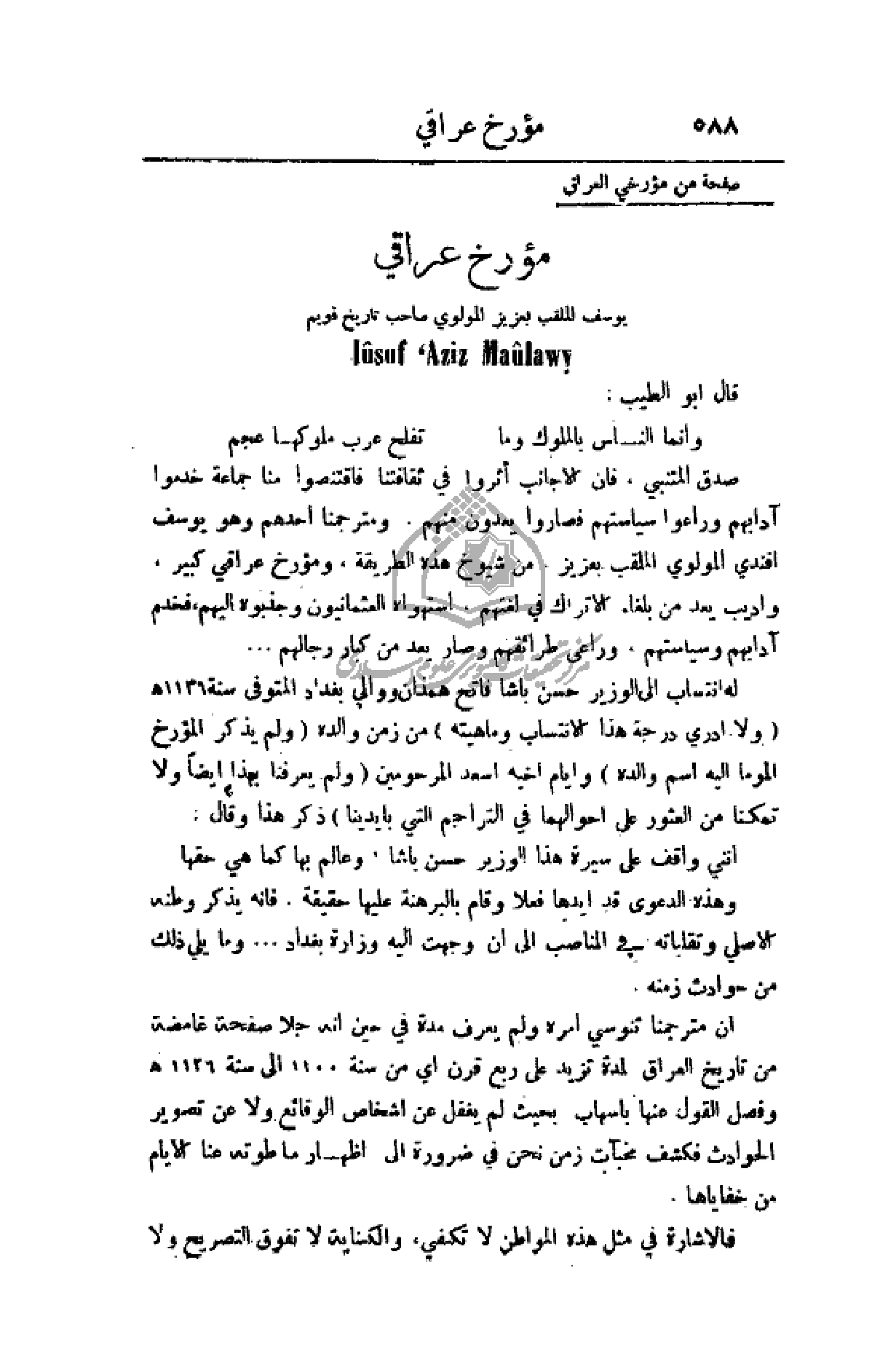 صدق المتنبي، فأن الأجانب أثروا في ثقافتنا فاقتنصوا منا جماعة خدموا آدابهم وراعوا سياستهم فصاروا يعدون منهم. ومترجمنا أحدهم وهو يوسف أفندي المولوي الملقب بعزيز. من شيوخ هذه الطريقة، ومؤرخ عراقي كبير، وأديب يعد من بلغاء الأتراك في لغتهم، استهواه العثمانيون وجذبوه إليهم، فخدم آدابهم وسياستهم، وراعى طرائقهم وصار يعد من كبار رجالهم. . .
