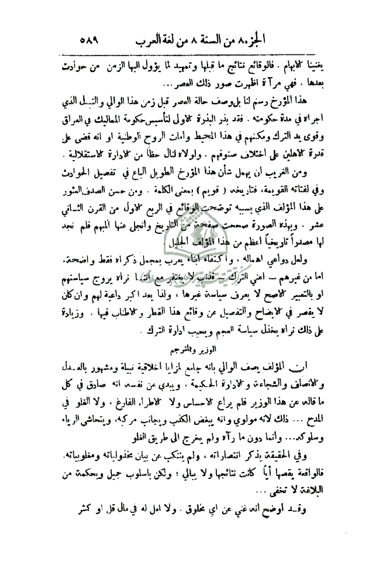 ولعل دواعي أهماله، واكتفاء أبناء يعرب بمجمل ذكراه فقط واضحة، أما من غيرهم - أعني الترك - فذنب لا يغتفر مع أننا نراه يروج سياستهم أو بالتعبير الأصح لا يعرف سياسة غيرها، ولذا يعد أكبر داعية لهم وأن كان لا يقصر في الإيضاح والتفصيل عن وقائع هذا القطر والإطناب فيها. وزيادة على ذلك نراه يخذل سياسة العجم ويحبب إدارة الترك.