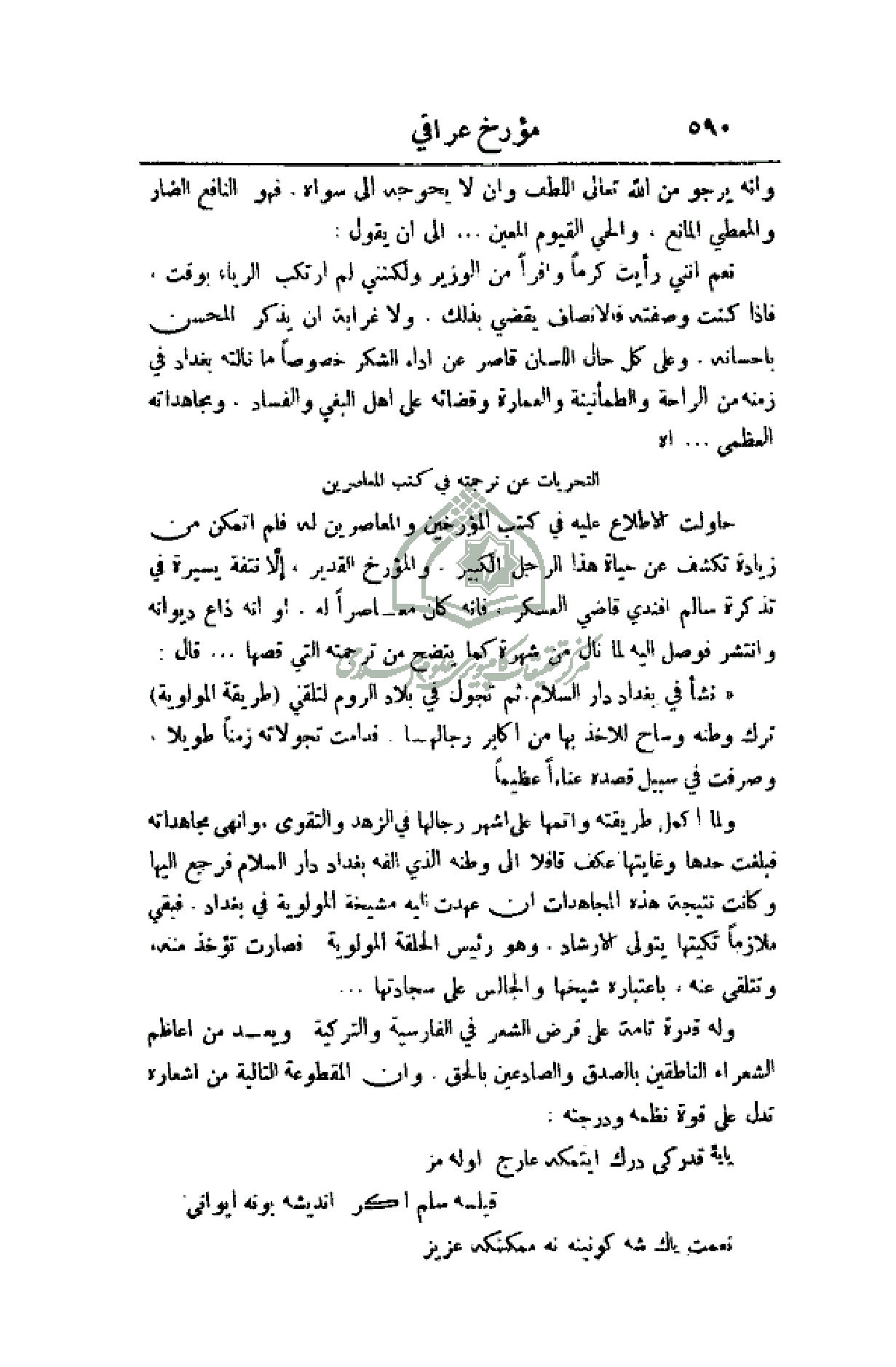 (نشأ في بغداد دار السلام. ثم تجول في بلاد الروم لتلقي (طريقة المولوية) ترك وطنه وساح للأخذ بها من أكابر رجالها فدامت تجولاته زمناً طويلاً وصرفت في سبيل قصده عناءاً عظيماً.