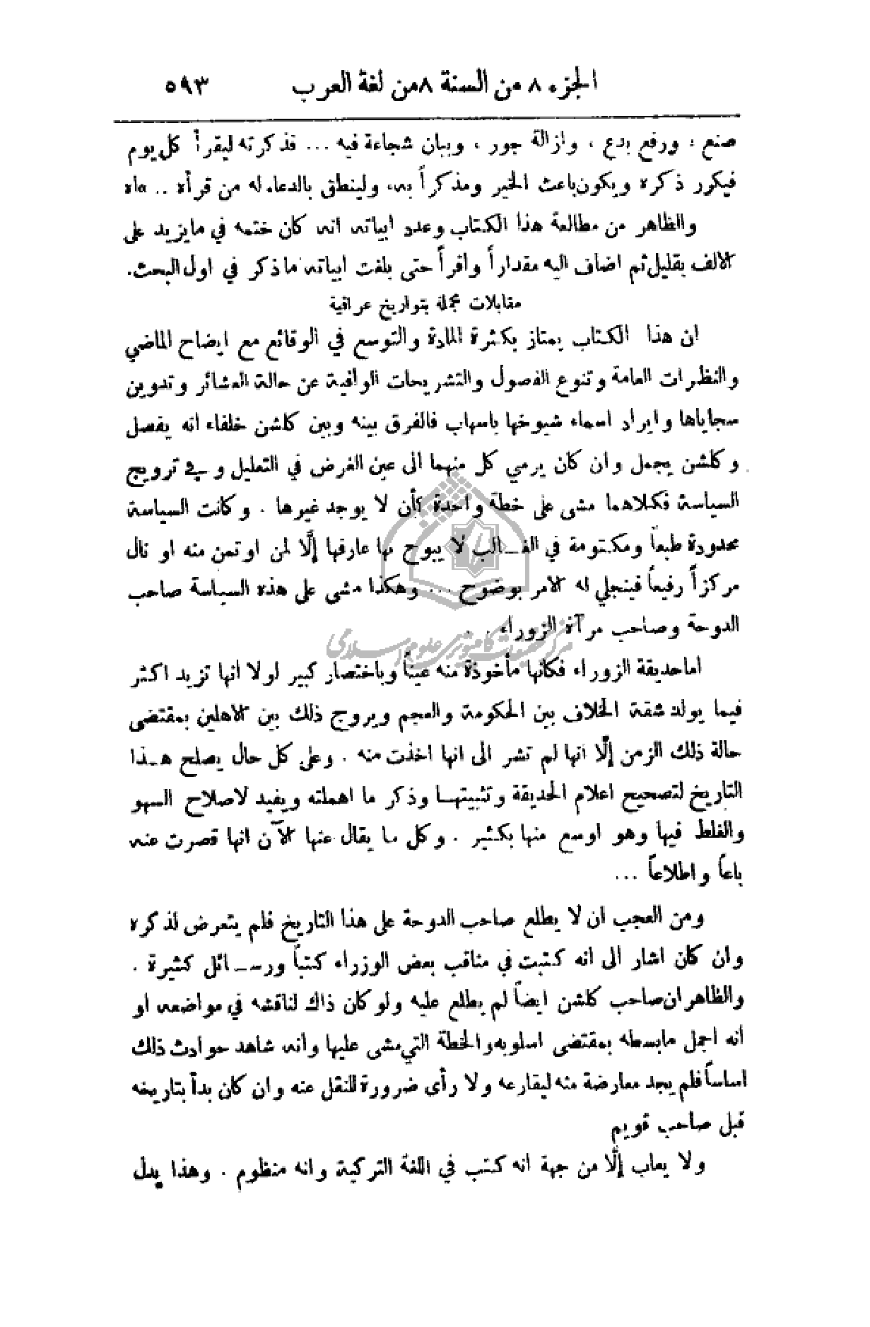أما حديقة الزوراء فكأنها مأخوذة منه عيناً وباختصار كبير لولا أنها تزيد أكثر فيما يولد شقة الخلاف بين الحكومة والعجم ويروج ذلك بين الأهلين بمقتضى حالة ذلك الزمن إلا أنها لم تشر إلى أنها أخذت منه. وعلى كل حال يصلح هذا التاريخ لتصحيح أعلام الحديقة وتثبيتها وذكر ما أهملته ويفيد لإصلاح السهو والغلط فيها وهو أوسع منها بكثير. وكل ما يقال الآن أنها قصرت عنه باعاً وإطلاعاً. . .