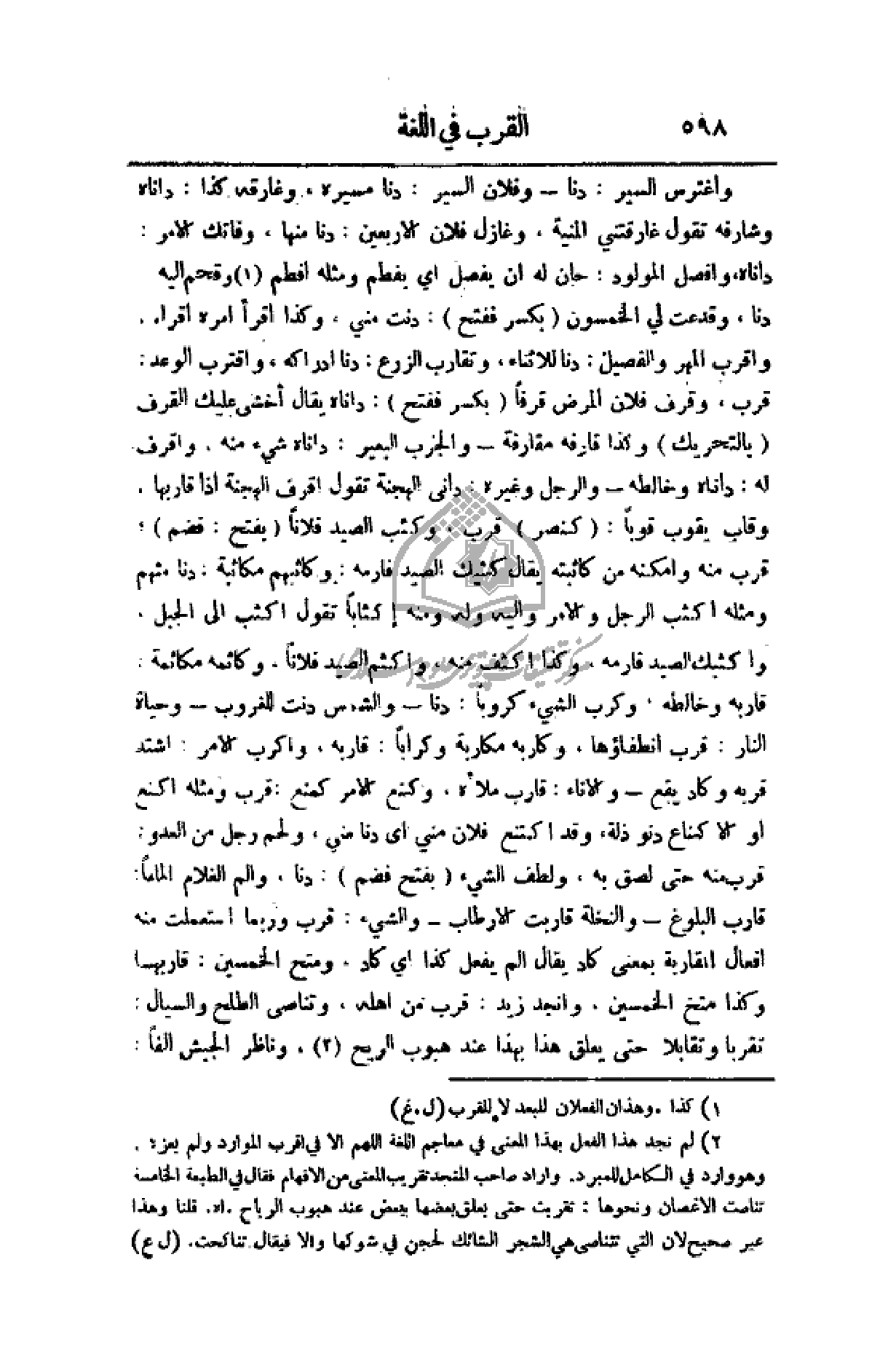 واعترس السير: دنا - وفلان السير: دنا مسيرة وغارقه كذا: داناه وشارفة تقول غارقتني المنية، وغازل فلان الأربعين: دنا منها، وفاتك الأمر: داناة، وأفصل المولود: حان له أن يفعل أي يفطم ومثله أفطم وقحم إليه: دنا، وقدعت لي الخمسون (بكسر ففتح): دنت مني، وكذا أقرأ أمره إقراء. واقرب المهر والفصيل: دنا للإثناء وتقارب الزرع: دنا أدراكه، واقترب الوعد: قرب، وقرف فلان المرض قرفاً (بكسر ففتح): داناه يقال أخشى عليك القرف (بالتحريك) وكذا قارفه مقارفة - والجرب البعير: داناه شيء منه. وأقرف له: داناه وخالطه - والرجل وغيره: دانى الهجنة تقول أقرف الهجنة إذا قاربها، وقارب يقول قوباً: (كنصر) قرب، وكثب الصيد فلاناً (بفتح: فضم): قرب منه وأمكنه من كاثبته يقال كشبك الصيد فارمه: ومكاثبهم مكاثبة: دنا منهم ومثله أكثب الرجل والأمر وغليه وله ومنه إكثاباً تقول أكثب إلى الجبل، وأكثبك الصيد فارمه، وكذا اكثف منه، وأكثم الصيد فلاناً، وكاثمه