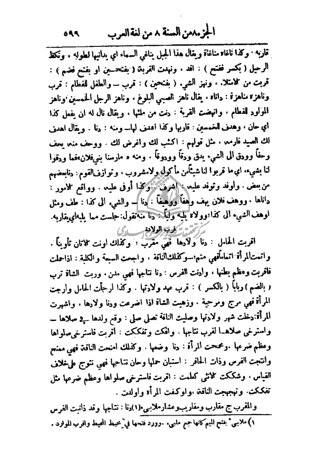 أقربت الحامل: دنا دنا ولادها فهي مقرب: وكذلك أونت الأتان تأويناً وأتمت المرأة إتماماً فهي متم هو كذلك الناقة، وأجحت السبعة والكلبة: إذا حملت فأقربت وعظم بطنها، وأدنت الفرس: دنا نتاجها فهي مدن، وربت الشاه قرب (بالضم) رباباً (بالكسر): قرب عهد ولادتها. وكذا أرجأت الحامل وأرجت المرأة فهي مرج ومرجية. وزهيت الشاة إذا اضرعت ودنا ولادها، وأشهرت المرأة دخلت شهر وصليت الناقة تصلي صلى: وقع ولدها في صلاها - واسترخى صلاها لقرب نتاجها. وأفكت وتفككت: أقربت فاسترخى صلواها