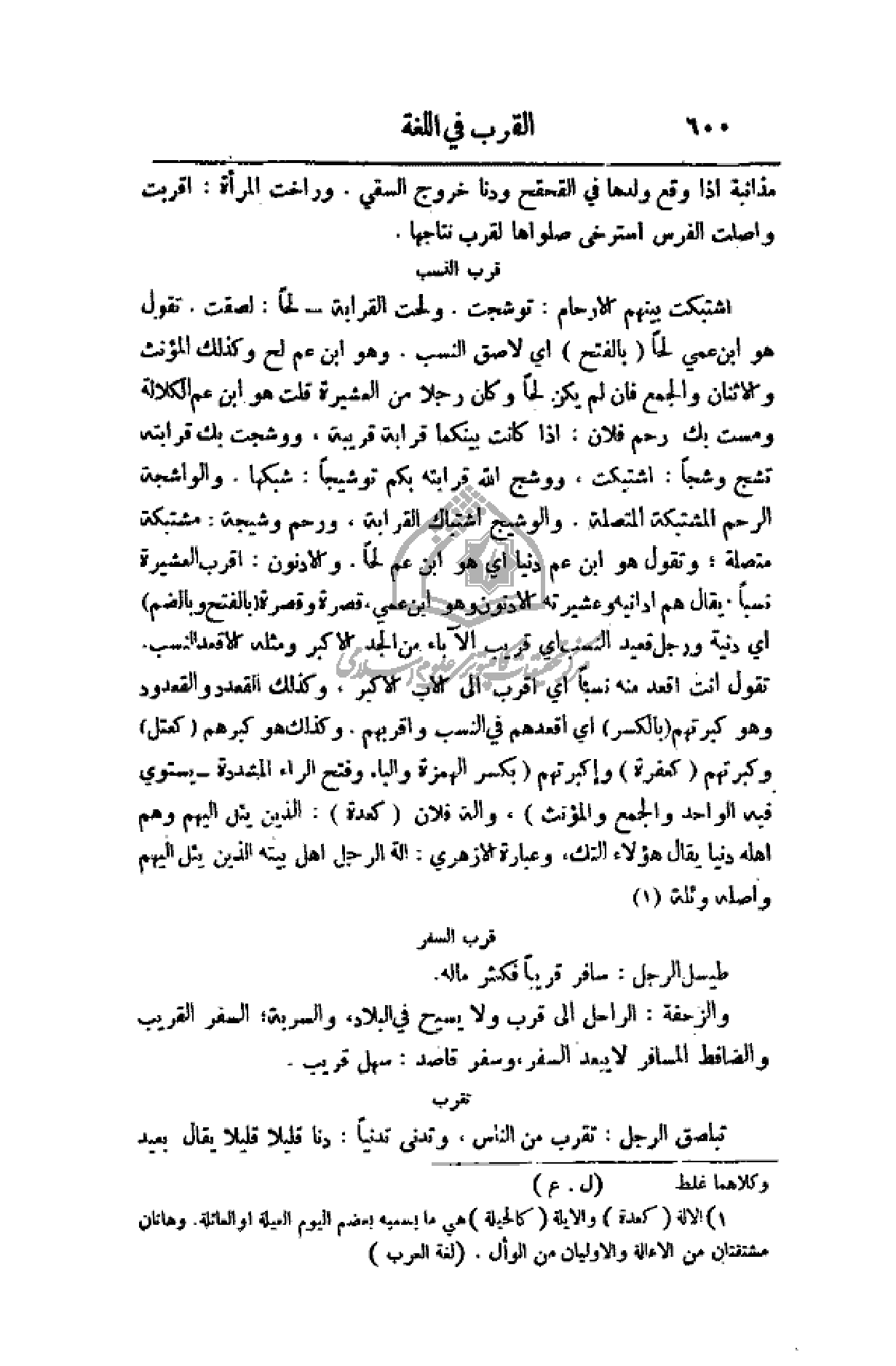 اشتبكت بينهم الأرحام: توشجت ولحت القرابة - لحاً: لصقت. تقول هو أبن عمي لحاً (بالفتح) أي لاصق النسب. وهو أبن عم لح وكذلك المؤنث والاثنان والجمع فأن لم يكن لحاً وكان رجلاً من العشيرة قلت هو أبن عم الكلالة ومست بك رحم فلان: إذا كانت بينكما قرابة قريبة، ووشجت بك قرابته تشج وشجاً: اشتبكت، ووشج الله قرابته بكم توشيجاً: شبكها. والواشجة الرحم المشتبكة المتصلة. والشيج اشتباك القرابة، ورحم وشيجة: مشتبكة متصلة، وتقول هو ابن عم دنيا أي هو أبن عم لحاً. والأدنون: أقرب العشرية نسباً. يقال هم أدانيه وعشيرته الإدنون وهو أبن عمي، قصرة وقصرة (بالفتح وبالضم) أي دنية ورجل قعيد النسب أي قريب الآباء من الجد الأكبر ومثله الأقعد النسب. تقول أنت أقعد منه نسباً أي أقرب إلى الأب الأكبر، وكذلك القعدد والقعدود وهو كبرتهم (بالكسر) أي أقعدهم في النسب وأقربهم. وكذلك هو كبرهم (كعتل) وكبرتهم (كعفرة) وأكبرتهم (بكسر الهمزة والباء وفتح المشدودة - يستوي فيه الواحد والجمع والمؤنث)، وآلة فلان (كعدة): الذين يأل إليهم وهم أهلة دنيا هؤلاء التك، وعبارة الأزهري: آلة الرجل أهل بيته الذين يأل إليهم وهم أهله دنيا يقال هؤلاء التك، وعبارة الأزهري: آلة الرجل أهل بيته الذين يأل إليهم واصله وئلة.