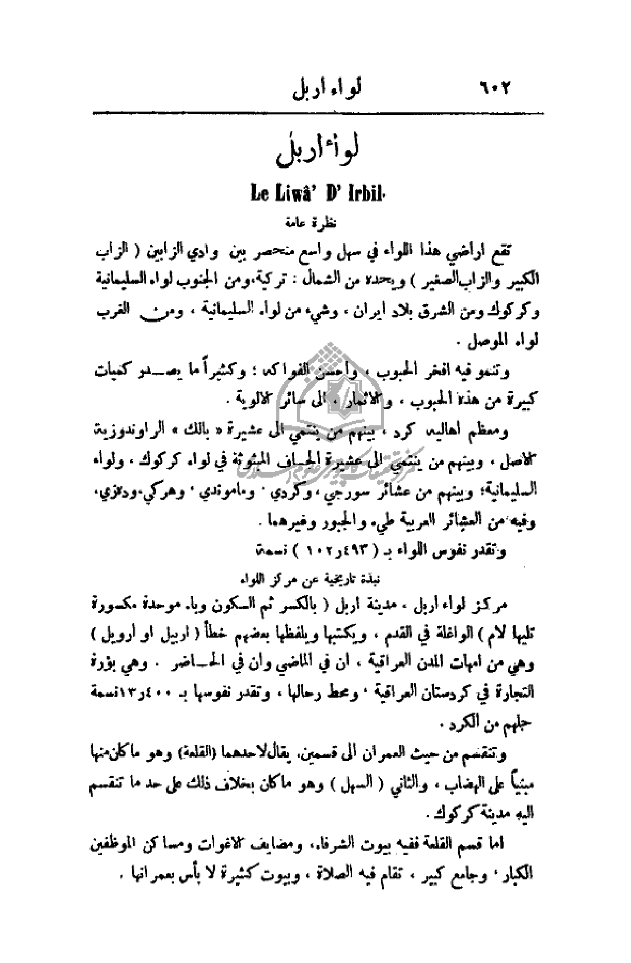 مركزاً لواء أربل، مدينة أربل (بالكسر ثم السكون وباء موحدة مكسورة تليها لأم) الواغلة في القدم، ويكتبها ويلفظها بعضهم خطأ (أربيل أو أرويل) وهي من أمهات المدن العراقية، أن في الماضي وأن في الحاضر، وهي بؤرة التجارة في كردستان العراقية، ومحط رجالها، وتقدر نفوسها ب 13. 400 نسمة جلهم من الكرد.