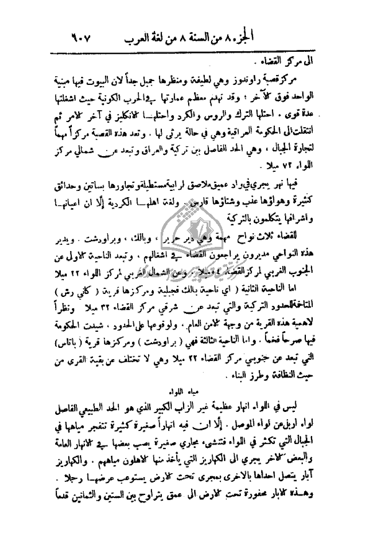 مركز قصبة رواندوز وهي لطيفة ومنظرها جميل جداً لأن البيوت فيها مبنية الواحد فوق الآخر، وقد تهدم معظم عمارتها في الحرب الكونية حيث أشغلتها عدة قوى. احتلها الترك والروس والكرد واحتلها الإنكليز في آخر المر ثم انتقلت إلى الحكومة العراقية وهي في حالة يرثى لها. وتعد هذه القصبة مركزاً مهماً لتجارة الجبال، وهي الحد الفاصل بين العراق وتبعد عن شمالي مركز اللواء 72 ميلاً.