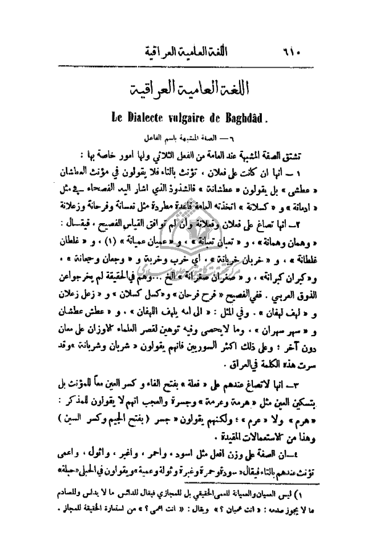2 - أنها تصاغ على فعلان وفعلانة وان لم توافق القياس الفصيح، فيقال: (وهمان وهمانة)، و (تعبان تعبانة)، و (عميان عميانة)، و (غلطان غلطانة)، و (خربان خربانة)، أي خرب وخربة و (وجعان وجعانة)، و (كبران كبرانة)، و (صغران صغرانة) الخ. . . وهم في الحقيقة لم يخرجوا عن الذوق العربي. ففي الفصيح (فرح فرحان) و (كسل كسلان) و (زعل زعلان) و (لهف لهفان). وفي المثل: (إلى أمة يلهف اللهفان). و (عطش عطشان) و (سهر سهران)، وما لا يحصى وفيه توهن لقصر العلماء الأوزان على معان دون آخر، وعلى ذلك أكثر السوريين فأنهم يقولون (شربان وشربانة) وقد سرت هذه الكلمة في العراق.