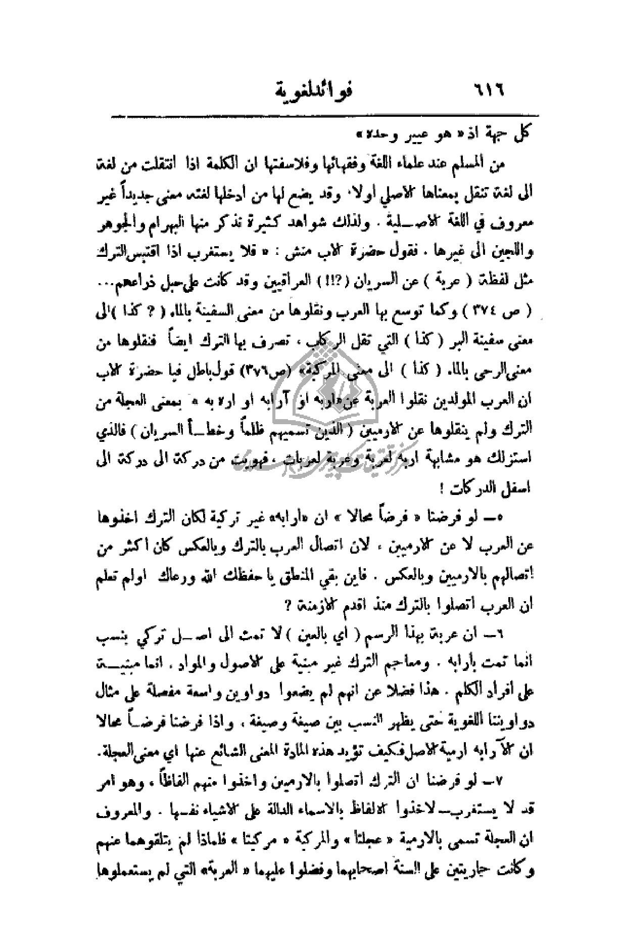 6 - أن عربة بهذا الرسم (أي بالعين) لا تمث إلى أصل تركي بنسب إنما تمت بإرابة. ومعاجم الترك غير مبنية على الأصول والمواد. إنما مبنية على أفراد الكلم. هذا فضلاً عن أنهم لم يضعوا دواوين واسعة مفصلة على مثال دواويننا اللغوية حتى يظهر النسب بين صيغة وصيغة، وإذا فرضنا فرضاً محالاً أن الإرابة أرمية الأصل فكيف تؤيد هذه المادة المعنى الشائع عنها أي معنى العجلة.