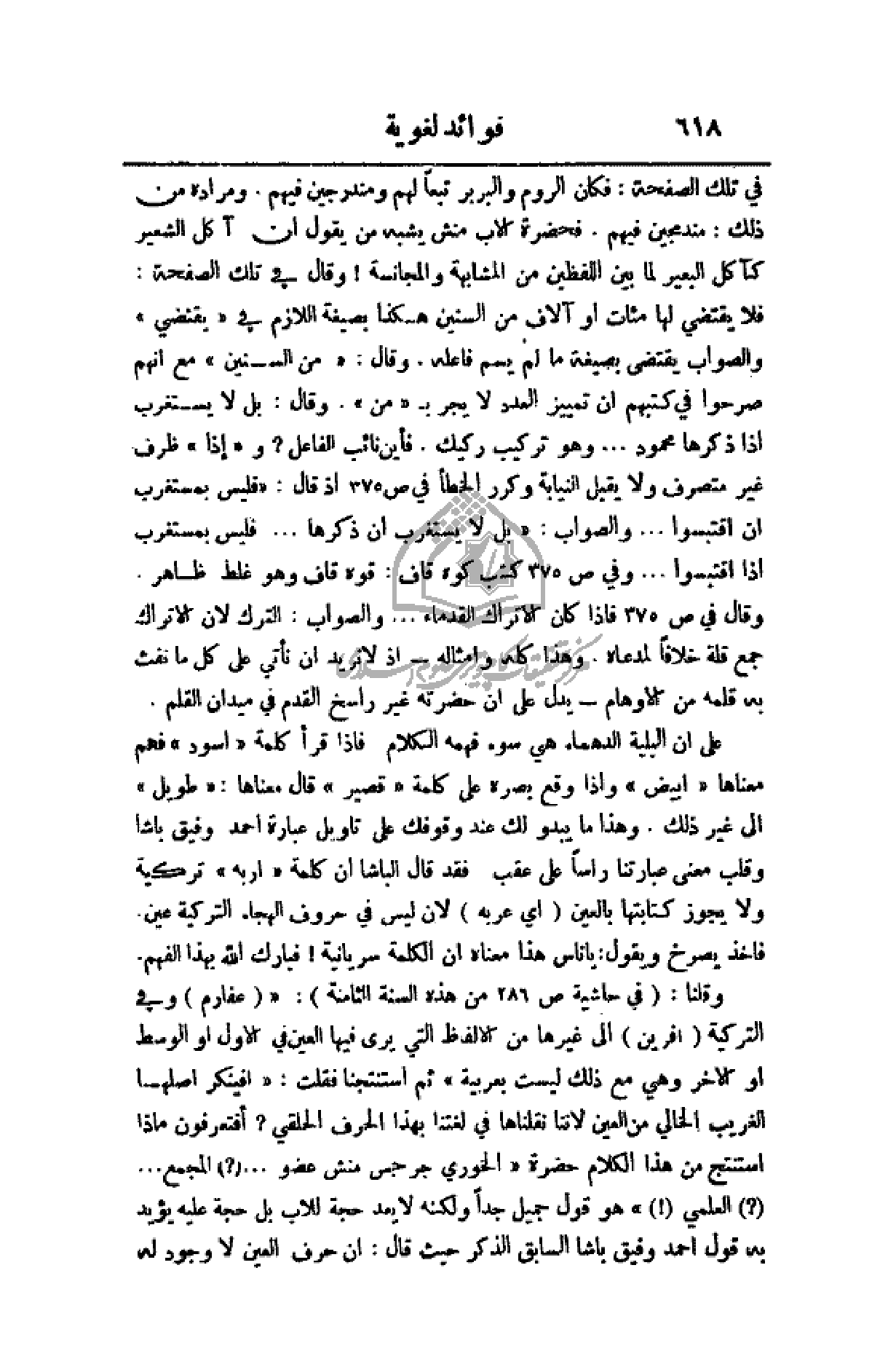 ذكرها. . . فليس بمستغرب إذا اقتبسوا. . . وفي ص 375 كتب كوه قاف: قوه قاف وهو غلط ظاهر. وقال في ص 375 فإذا كان الأتراك القدماء. . . والصواب: الترك لأن الأتراك جمع قلة خلافاً لمدعاة. وهذا كله وأمثاله - إذ لا نريد أن نأتي على كل ما نفث به قلمه من الأوهام - يدل على أن حضرته غير راسخ القدم في ميدان القلم.