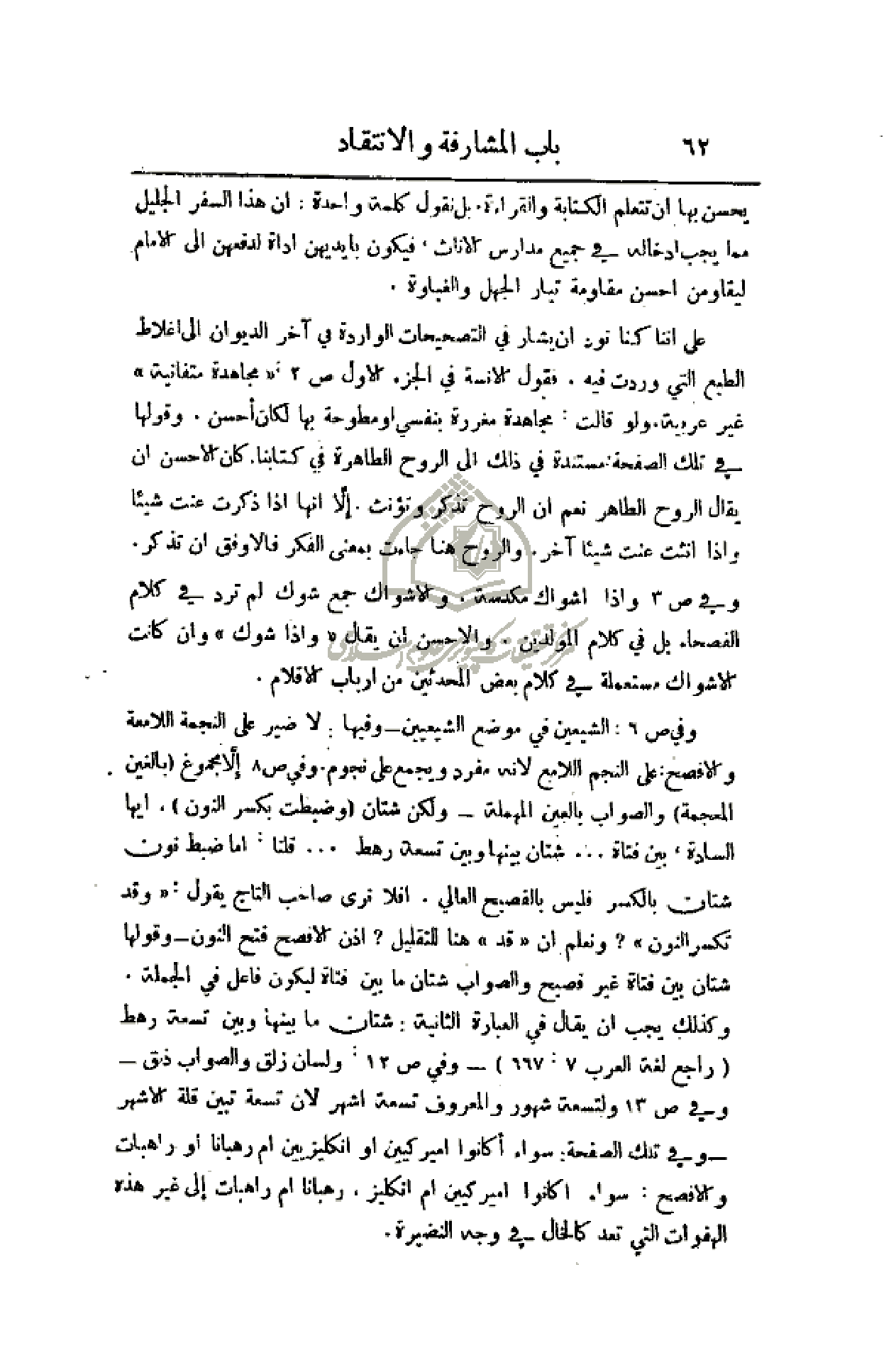 وكذلك يجب أن يقال في العبارة الثانية: شتان ما بينها وبين تسعة رهط (راجع لغة العرب 667: 7) - وفي ص12 ولسان زاق والصواب ذق - وفي ص13 ولتسعة شهور والمعروف تسعة أشهر لأن تسعة تبين قلة الأشهر - وفي تلك الصفحة: سواء أكانوا أمريكيين أو إنكليزيين أم رهباناً أم راهبات والأفصح: سواء أكانوا أميركيين أو إنكليز، رهباناً أم راهبات إلى غير هذه الهفوات التي تعد كالخال في وجه النضيرة.