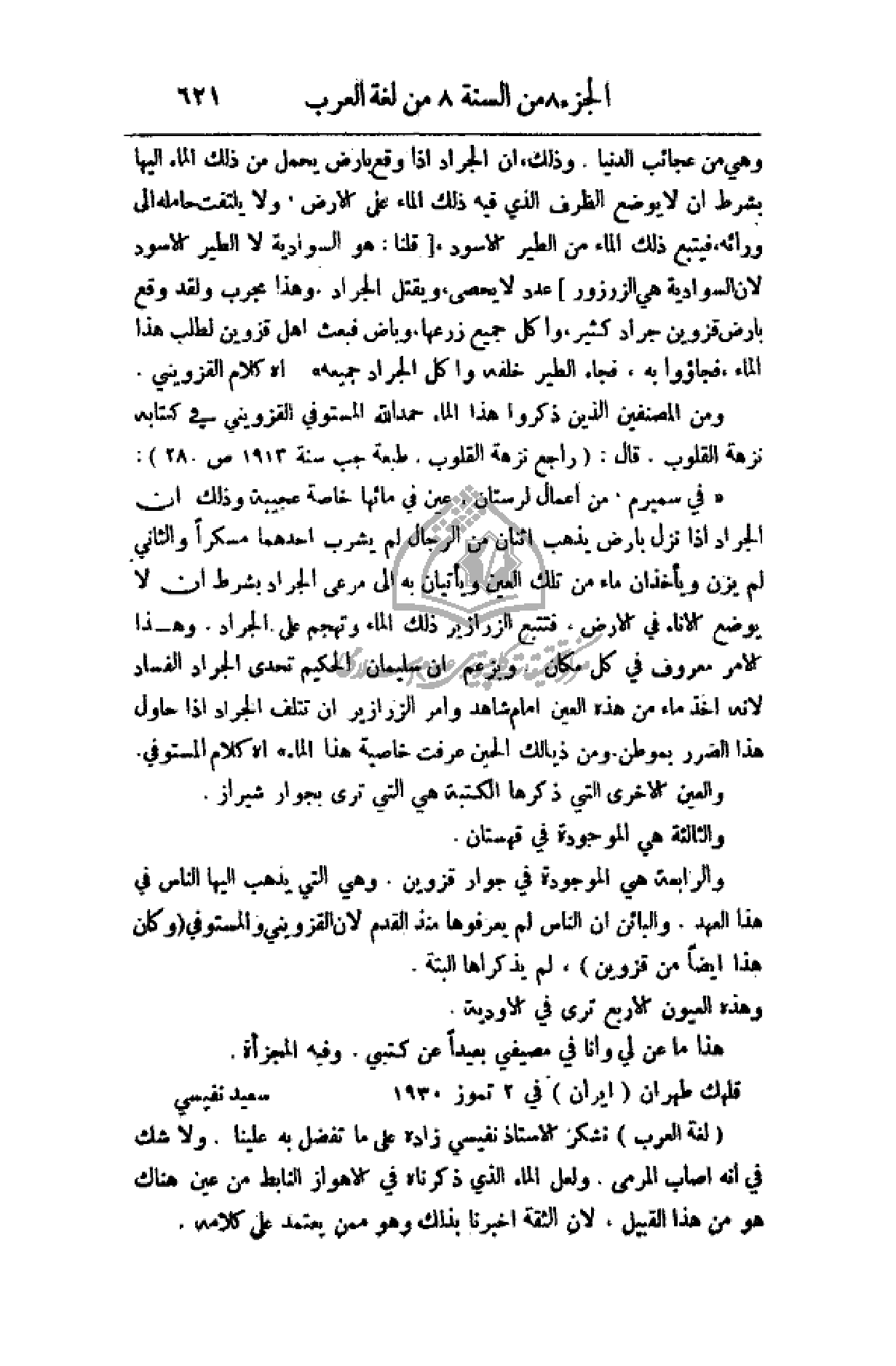 (لغة العرب) نشكر الأستاذ نفسي زاده على تفضل به علينا. ولا شك في أنه أصاب المرمى ولعل الماء الذي ذكرناه في الأهواز النابط من عين هناك هو من هذا القبيل. لأن الثقة اخبرنا بذلك وهو ممن يعتد على كلامه.