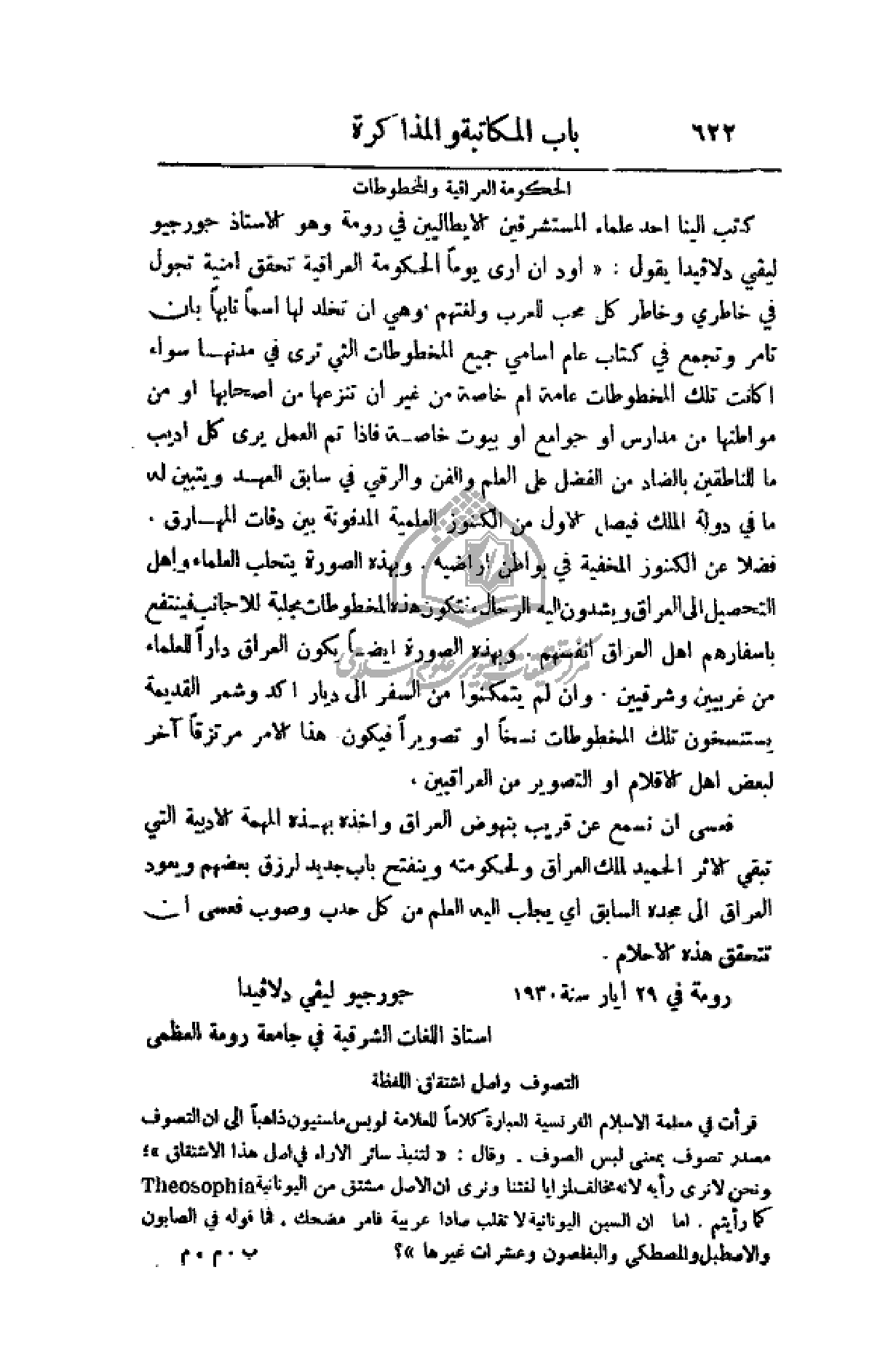 كتب إلينا أحد علماء المستشرقين الإيطاليين في رومة وهو الأستاذ جورجيو ليفي دلافيدا يقول: (أود أن أرى يوماً الحكومة العراقية تحقق أمنية تجول في خاطري وخاطر كل محب للعرب ولغتهم وهي أن تخلد لها اسماً نابهاً بأن تأمر وتجمع في كتابهم عام اسامي جميع المخطوطات التي ترى في مدنها سواء أكانت تلك المخطوطات عامة أم خاصة من غير أن تنزعها من أصحابها أو من مواطنها من مدارس أو جوامع أو بيوت خاصة فإذا تم العمل يرى كل أديب ما للناطقين بالضاد من الفضل على العلم والفن والرقي في سابق العهد ويتبين له ما في دولة الملك فيصل الأول من الكنوز العلمية المدفونة بين دفات المهارق، فضلاً عن الكنوز المخفية في بواطن أراضيه. وبهذه الصورة يتحلب العلماء وأهل التحصيل إلى العراق ويشدون إليه الرجال، لتكون هذه المخطوطات مجلبة للأجانب فينتفع بأسفارهم أهل العراق أنفسهم. وبهذه الصورة أيضاً يكون العراق داراً للعلماء من غربيين وشرقيين. وأن لم يتمكنوا من السفر إلى ديار أكد وشمر القديمة يستنسخون تلك المخطوطات نسخاً أو تصويراً فيكون هذا الأمر مرتزقاً آخر لبعض أهل الأقلام أو التصوير من العراقيين.