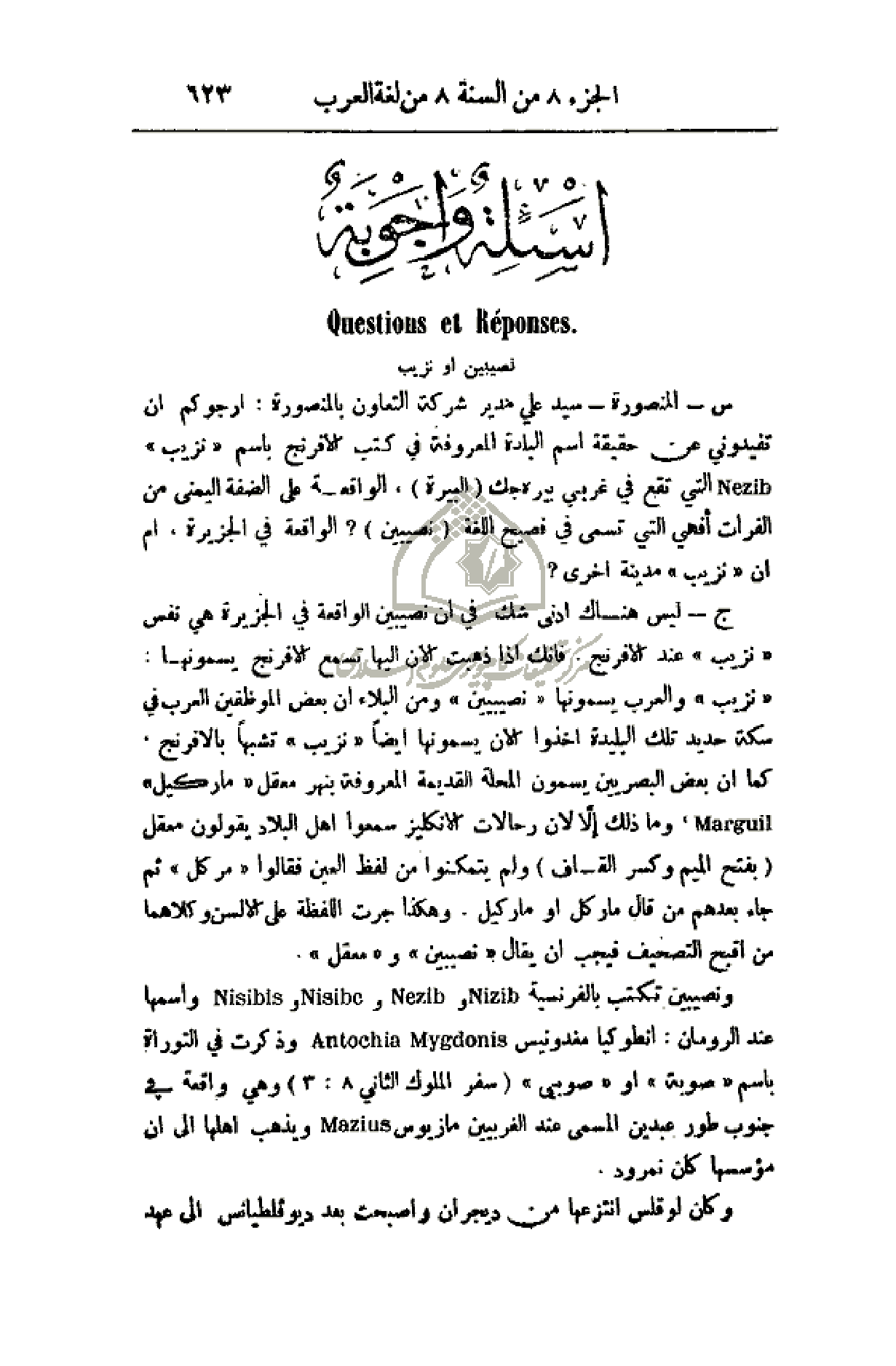 ج - ليس هناك أدنى شك في أن نصيبين الواقعة في الجزيرة هي نفس (نزيت) عند الإفرنج. فأنك إذا ذهبت الآن إليها تسمع الإفرنج يسمونها: (نزيب) والعرب يسمونها (نصيبين) ومن البلاء أن بعض الموظفين العرب في سكة حديد البليدة أخذوا الآن يسمونها أيضاً (نزيب) تشبهاً بالإفرنج كما أن بعض البصريين يسمون المحلة القديمة المعروفة بنهر معقل (ماركيل) وما ذلك إلا لأن رحالات الإنكليز سمعوا أهل البلاد يقولون معقل (بفتح الميم وكسر القاف) ولم يتمكنوا من لفظ العين فقالوا (مركل) ثم جاء بعدهم من قال ماركل أو ماركيل. وهكذا جرت اللفظة على الألسن وكلاهما من أقبح التصحيف فيجب أن يقال (نصيبين) و (معقل).